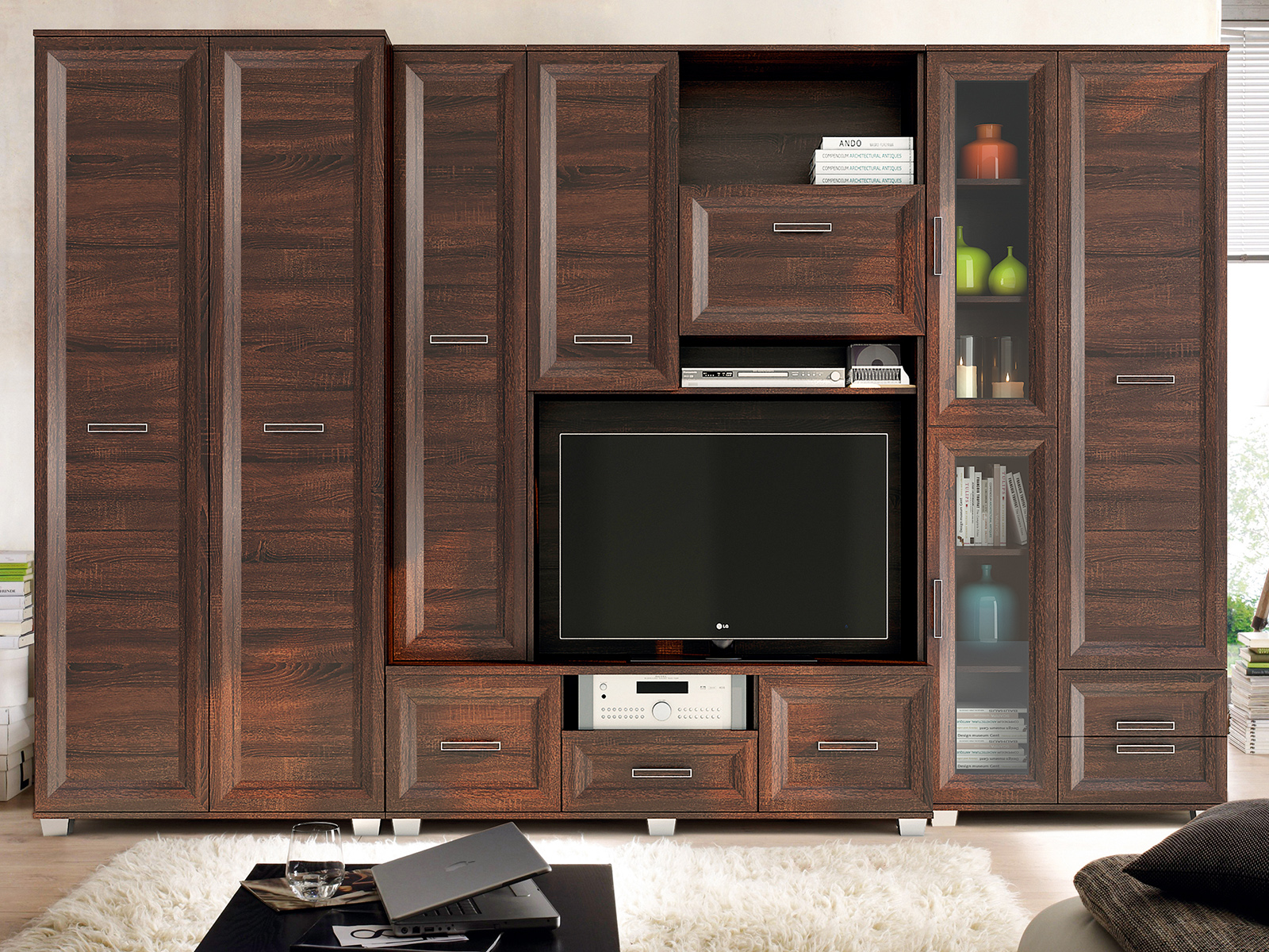 – vizualizacijoje pavaizduota sieninė spintelė yra šokolado spalvos