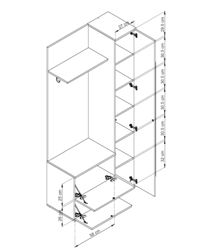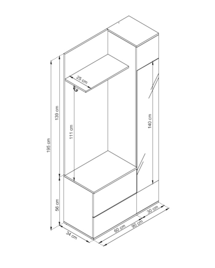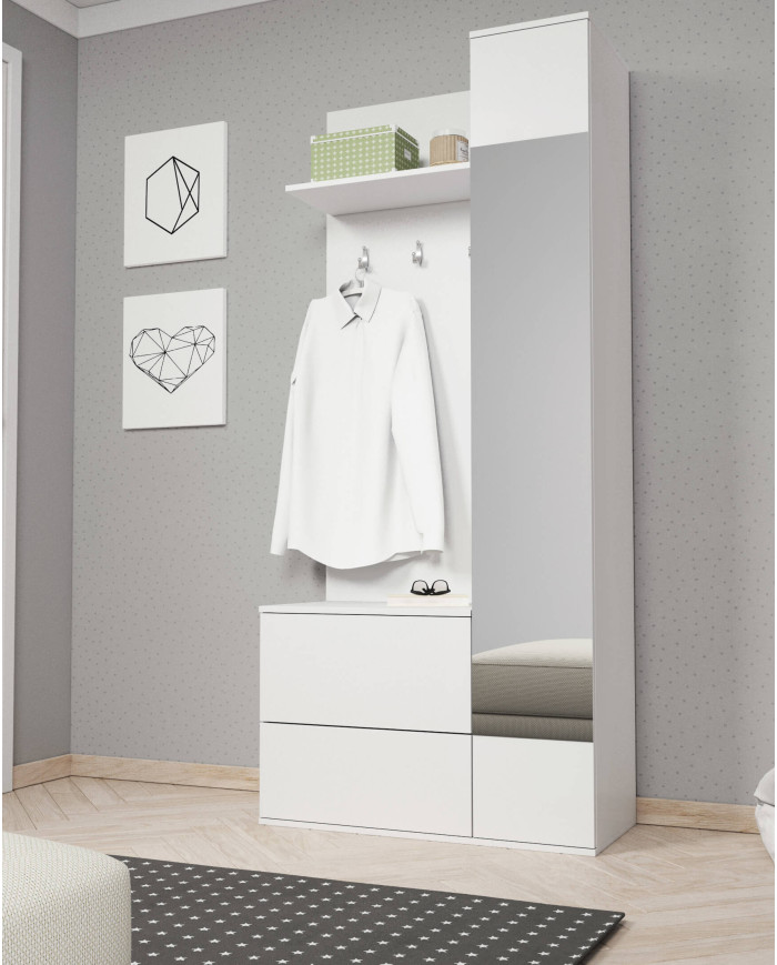 Žalia ir balta drabužių spinta pagaminta iš įbrėžimams atsparios ir lengvai valomos laminuotos baldinės plokštės. Komplektą sudaro batų spintelė, sienelė su pakabomis, praktiška lentyna ir spinta su lentynomis bei veidrodžiu. Spinta pristatoma supakuota, pateikiant aiškias surinkimo instrukcijas.