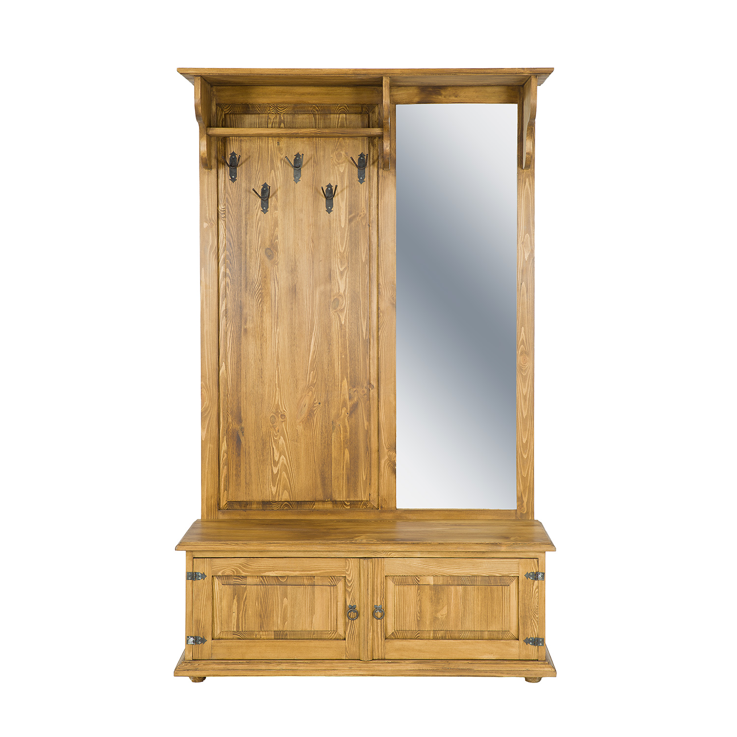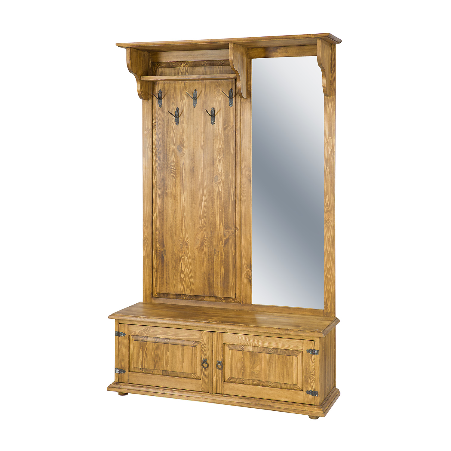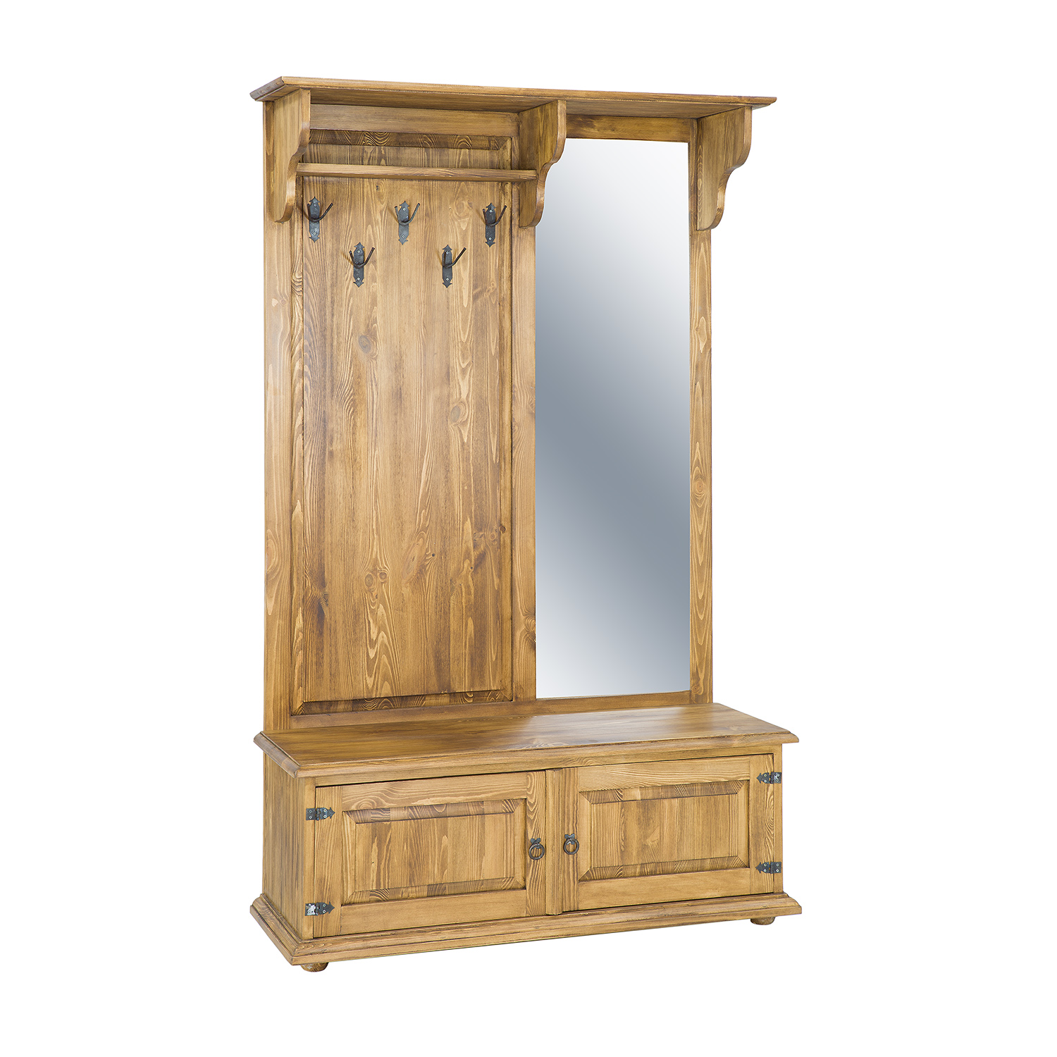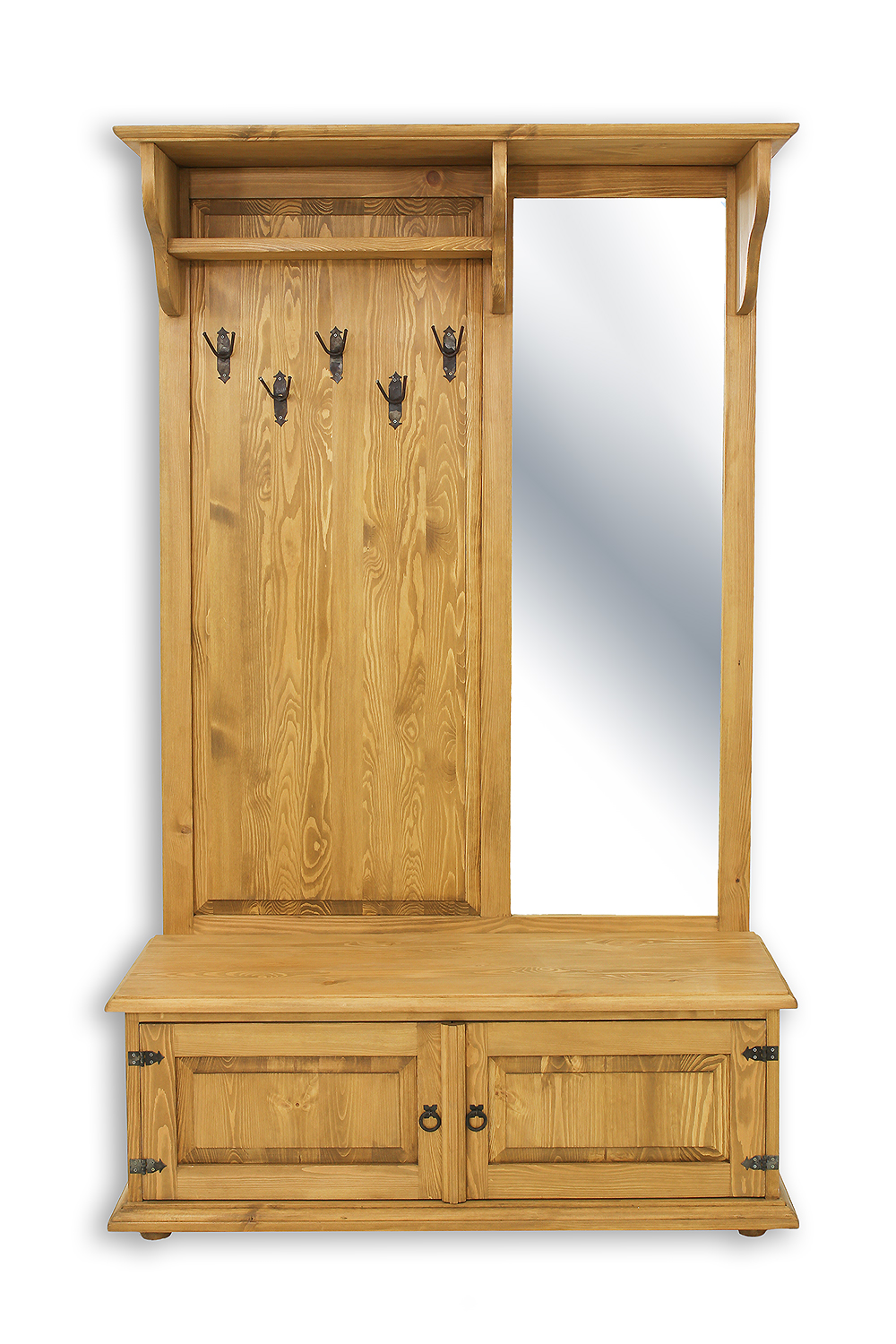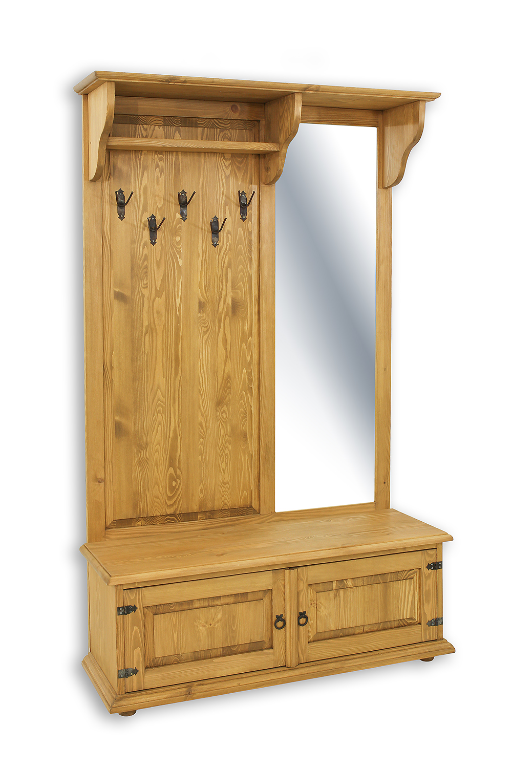 GR703 vaškuota spinta su veidrodžiu, sukurta kaimišku stiliumi, pagaminta iš tvirtos pušies medienos. Kairėje dalyje yra atvira lentyna, po kuria yra pakabos viršutiniams drabužiams. Dešinėje dalyje yra didelis veidrodis. Apatinėje dalyje yra funkcionali batų spintelė su dekoratyviniais fasadais. Baldas pasižymi patvaria ir tvirta konstrukcija. Jos gamyboje buvo panaudoti rankų darbo metaliniai vyriai ir rankenos su sendinto dizaino efektu. Ši spinta puikiai tinka net ir mažiems koridoriams. Ji suteiks bet kokiam interjerui unikalią atmosferą, kupiną šilumos ir jaukios atmosferos. Jos funkcionalumas labai palengvina daiktų laikymą.