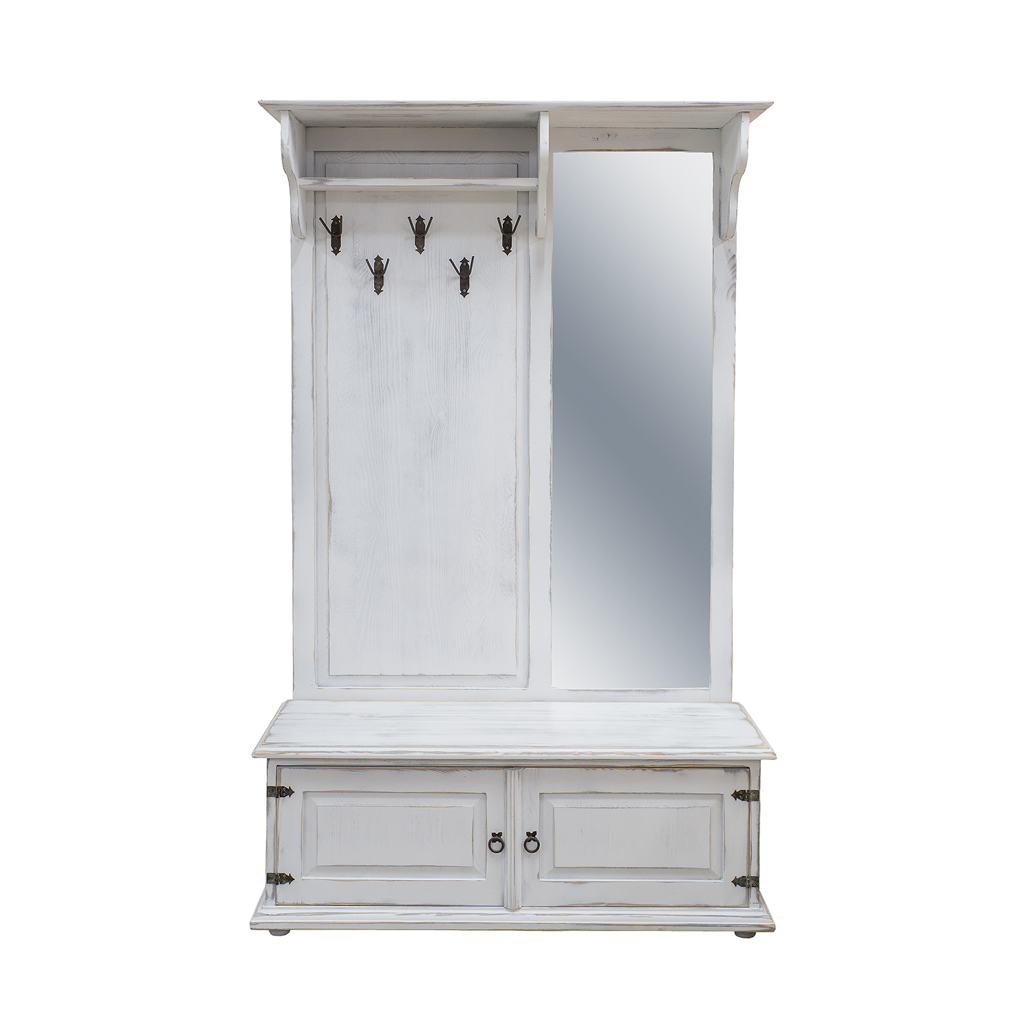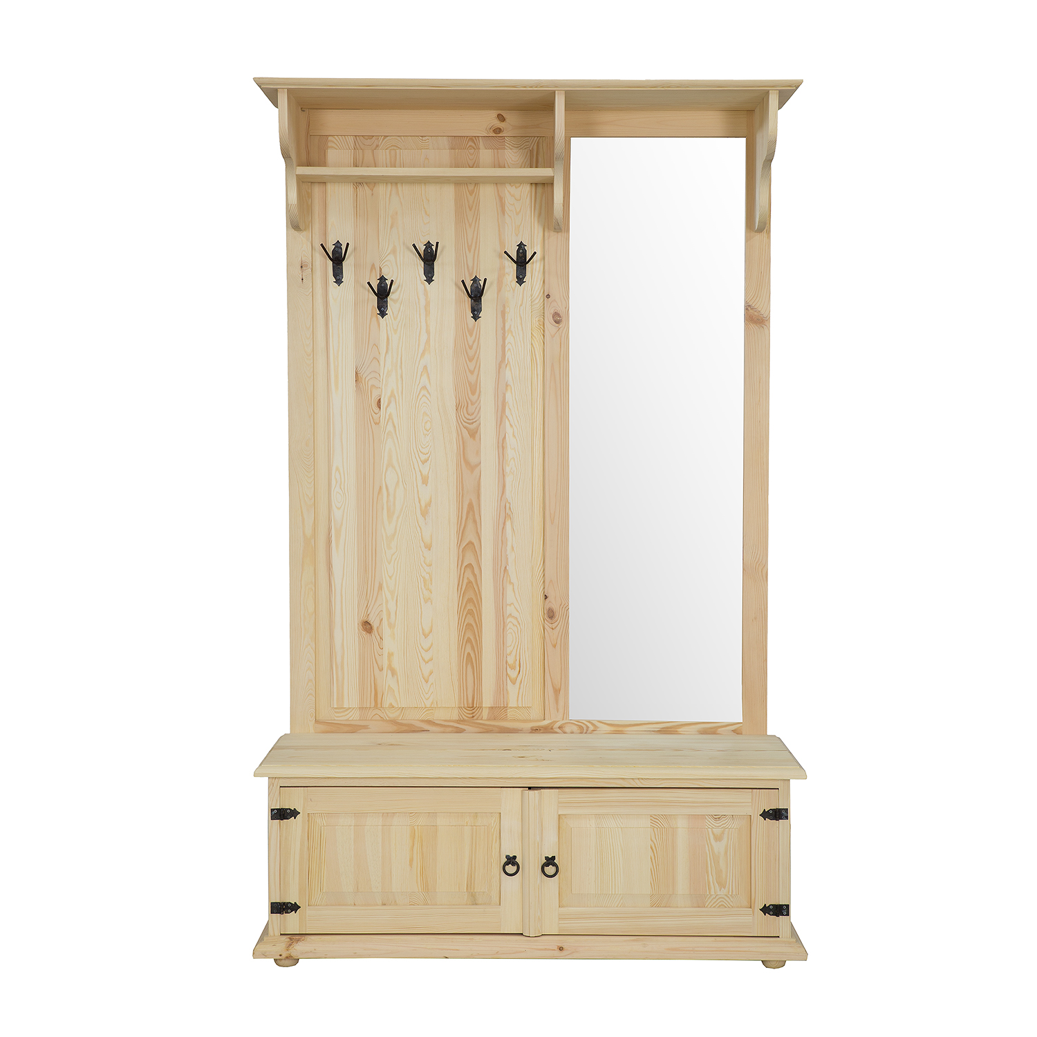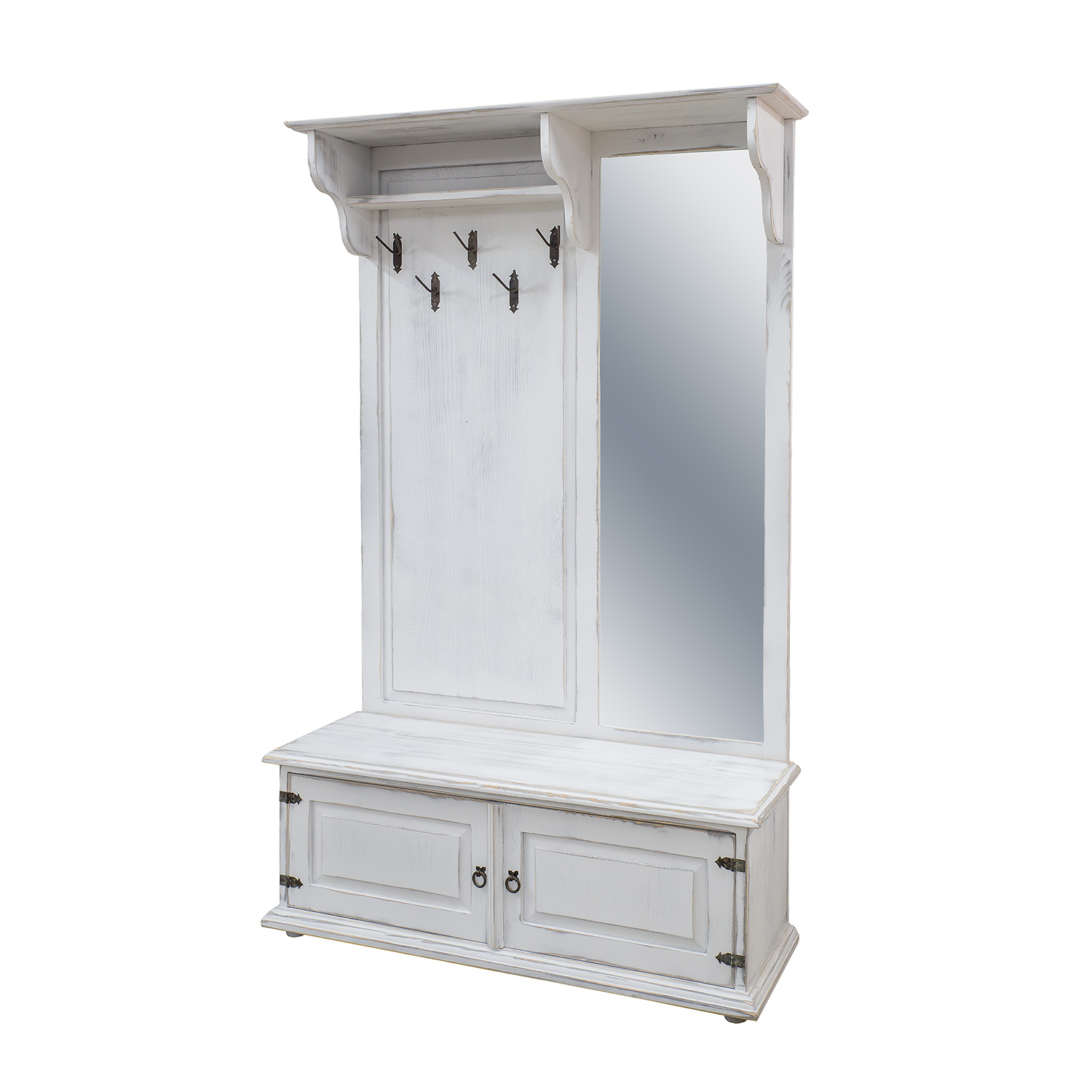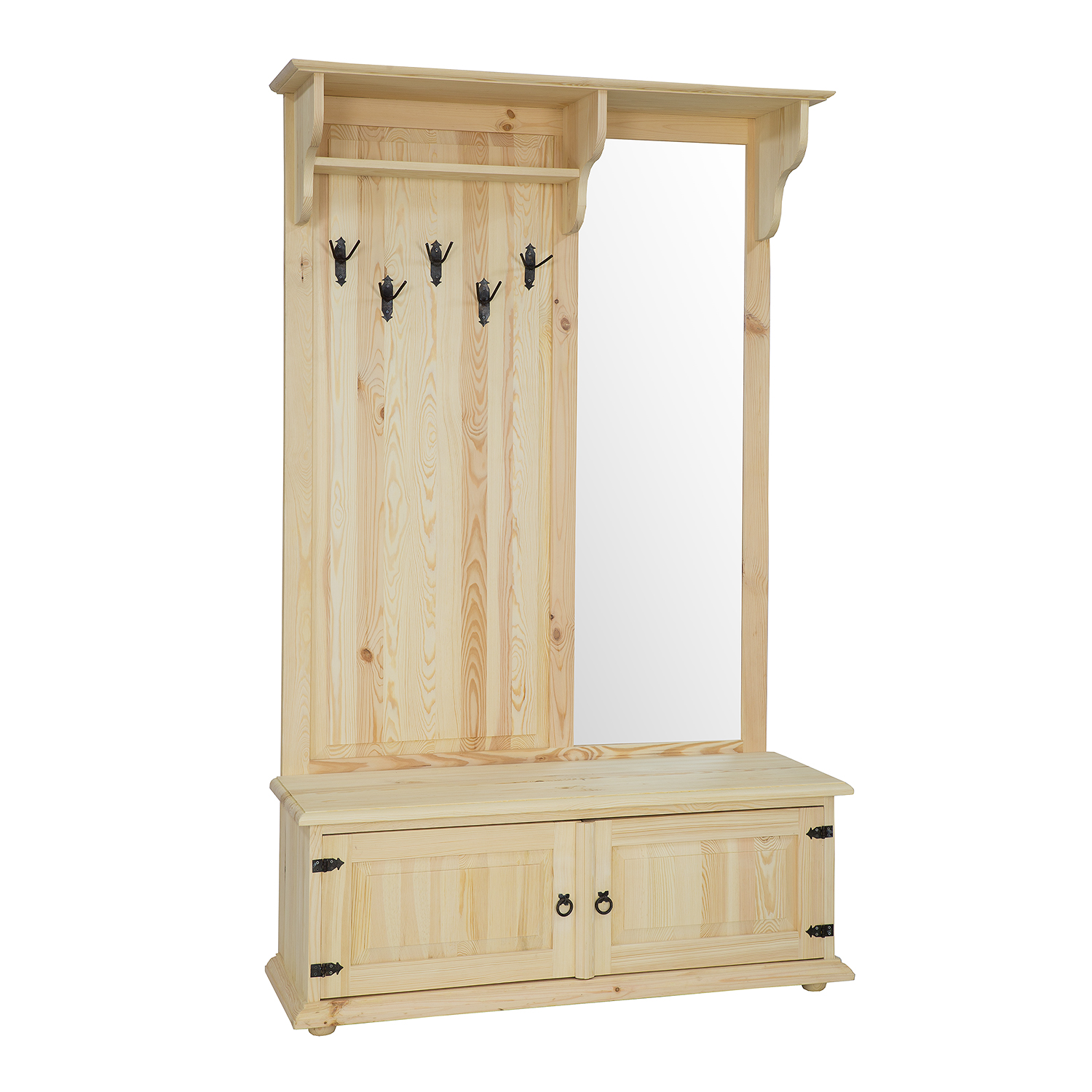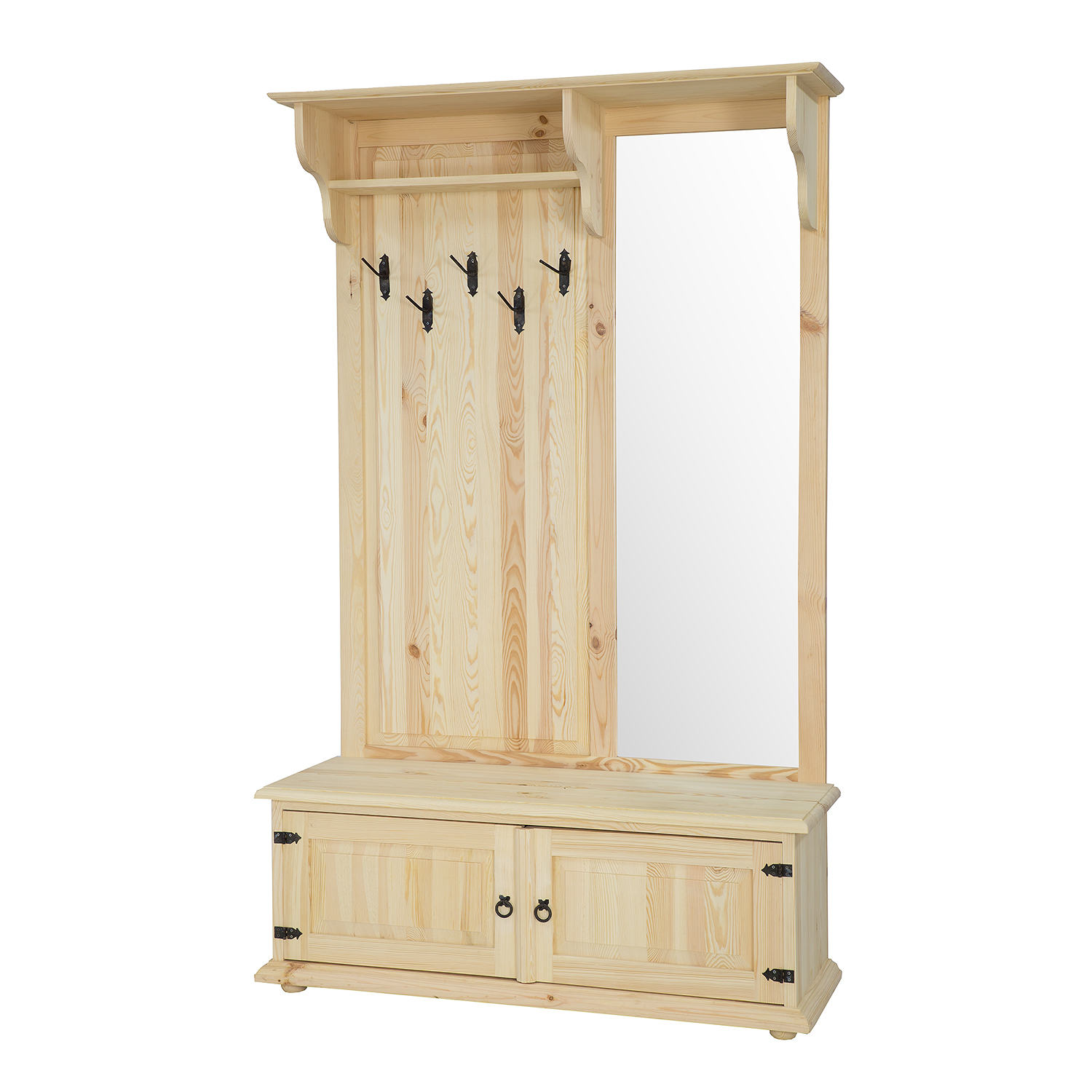 GR703 vaškuota spinta su veidrodžiu, sukurta kaimišku stiliumi, pagaminta iš tvirtos pušies medienos. Kairėje dalyje yra atvira lentyna, po kuria yra pakabos viršutiniams drabužiams. Dešinėje dalyje yra didelis veidrodis. Apatinėje dalyje yra funkcionali batų spintelė su dekoratyviniais fasadais. Baldas pasižymi patvaria ir tvirta konstrukcija. Jos gamyboje buvo panaudoti rankų darbo metaliniai vyriai ir rankenos su sendinto dizaino efektu. Ši spinta puikiai tinka net ir mažiems koridoriams. Ji suteiks bet kokiam interjerui unikalią atmosferą, kupiną šilumos ir jaukios atmosferos. Jos funkcionalumas labai palengvina daiktų laikymą.