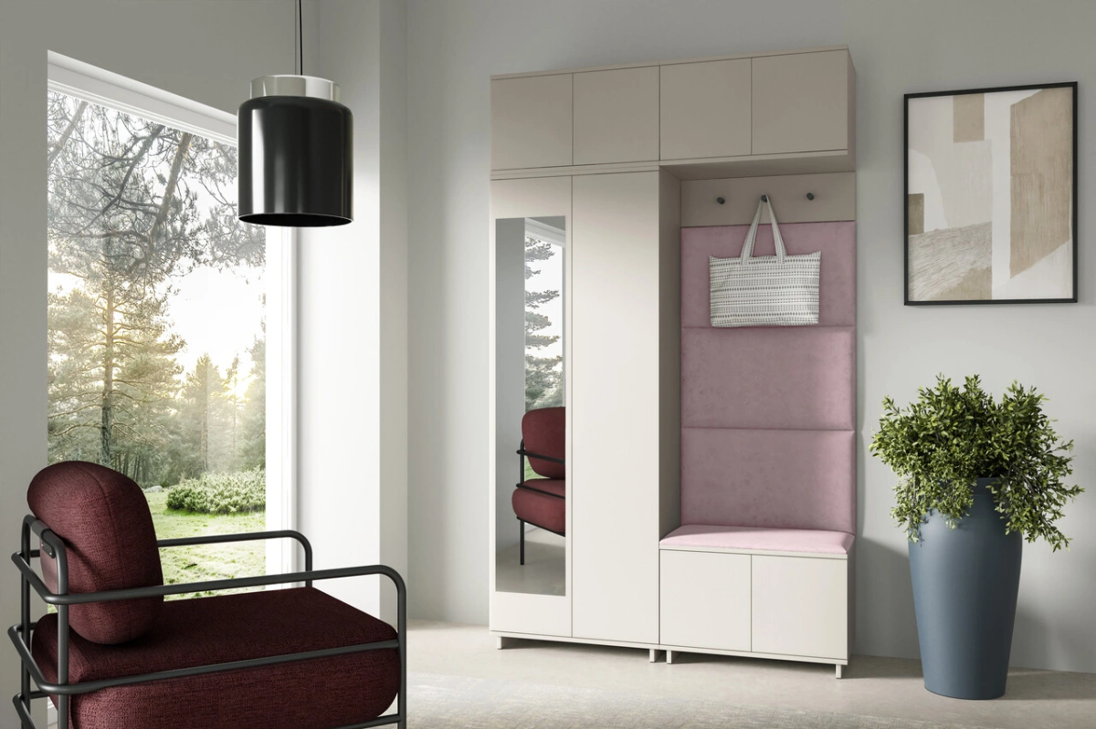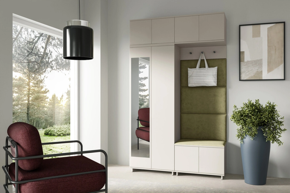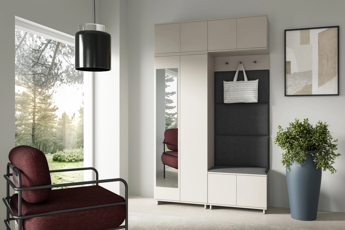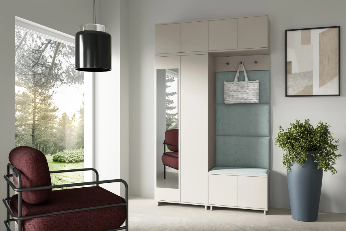 „Bianko 1“ apmuštą spintą sudaro 70 cm spinta + prailginimas, 70 cm batų spintelė, 70 cm pakabinama spintelė, kabykla paltams su kabliukais ir apmuštos panelės: