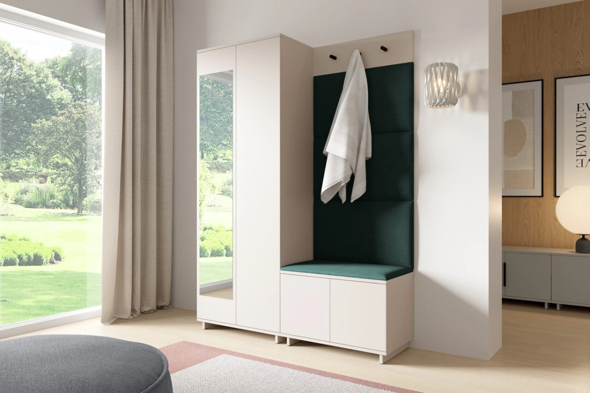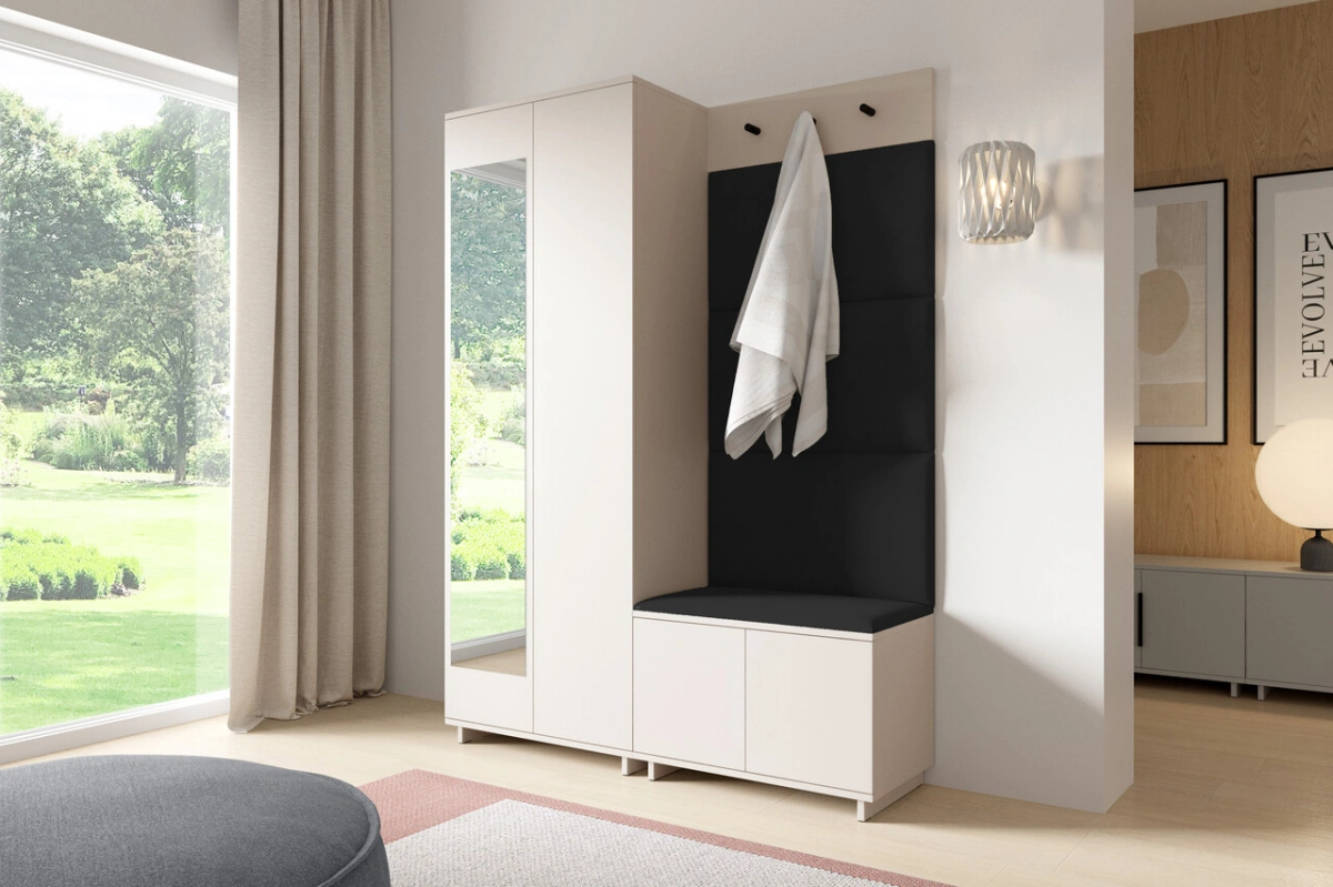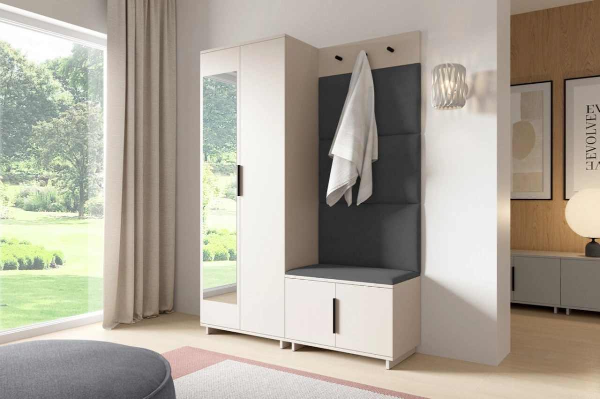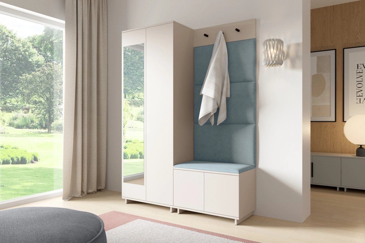 „Bianko 3“ apmuštą spintą sudaro 70 cm ilgio spinta, 70 cm ilgio batų spintelė, kabykla paltams ir apmuštos panelės: