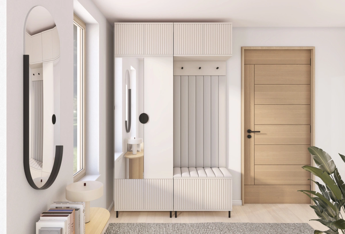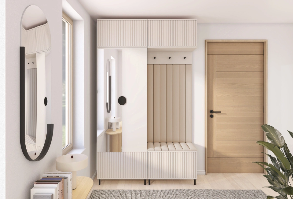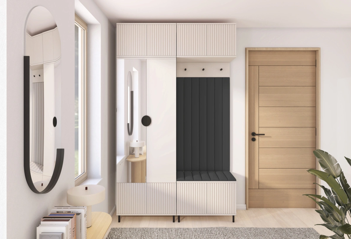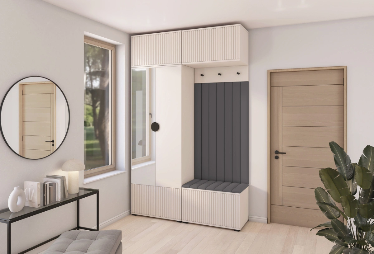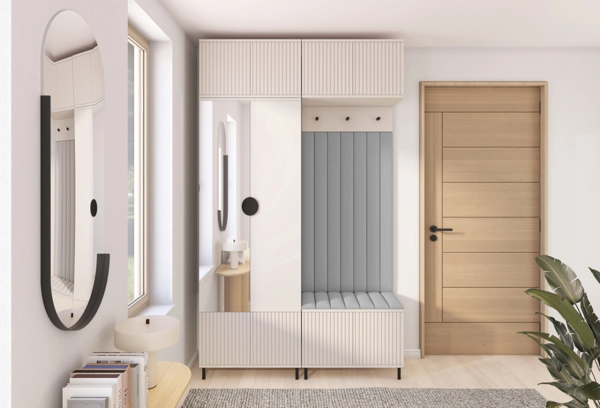 „Romeo 2“ apmuštą spintą sudaro 70 cm ilgio spinta, 2 praplėtimo moduliai, 70 cm ilgio batų spintelė, kabykla paltams su kabliukais ir apmuštos panelės:
