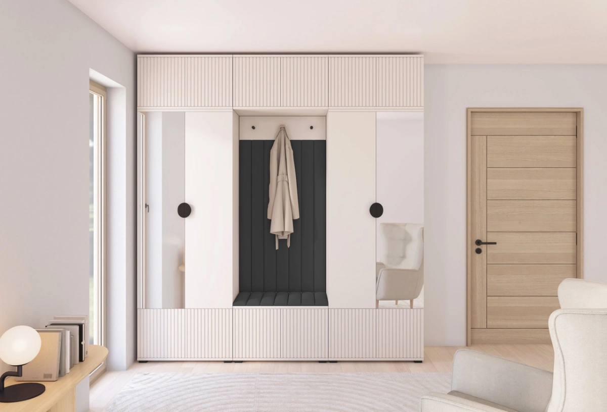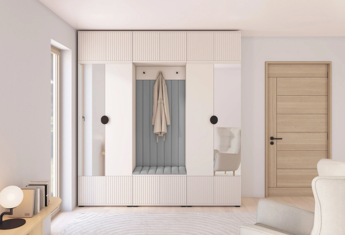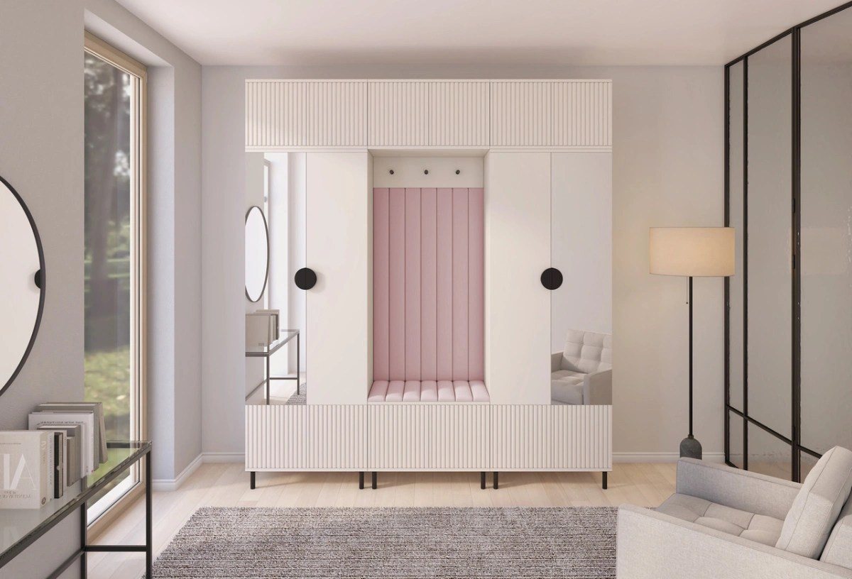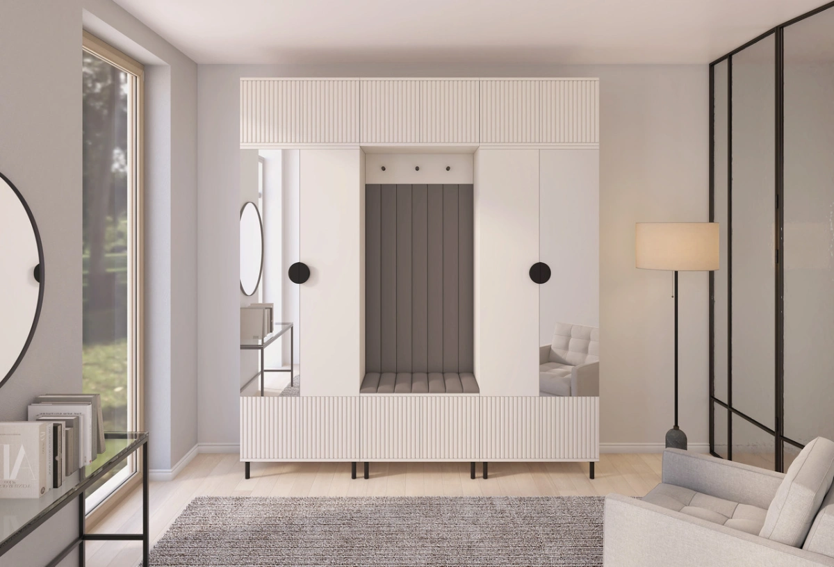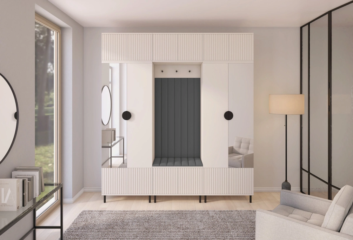 „Romeo 3“ apmuštą spintą sudaro dvi 70 cm spintos, du prailginimai, 70 cm batų spintelė, pakabinama spinta, kabykla paltams su kabliukais ir apmuštos panelės:
