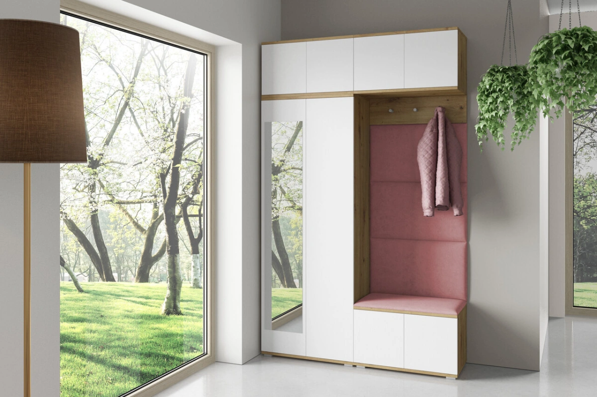 „Sewilla 3“ apmuštą spintą sudaro 70 cm ilgio spinta + du prailginimai, 70 cm ilgio batų spintelė, kabykla paltams ir apmuštos panelės: