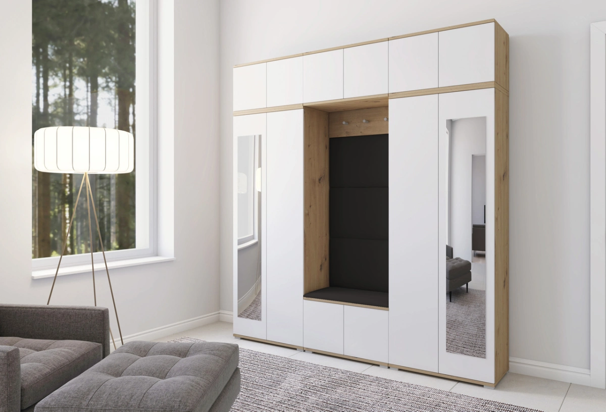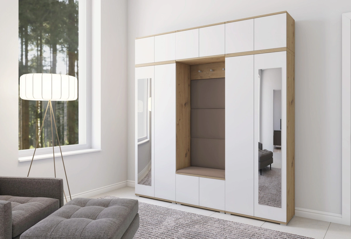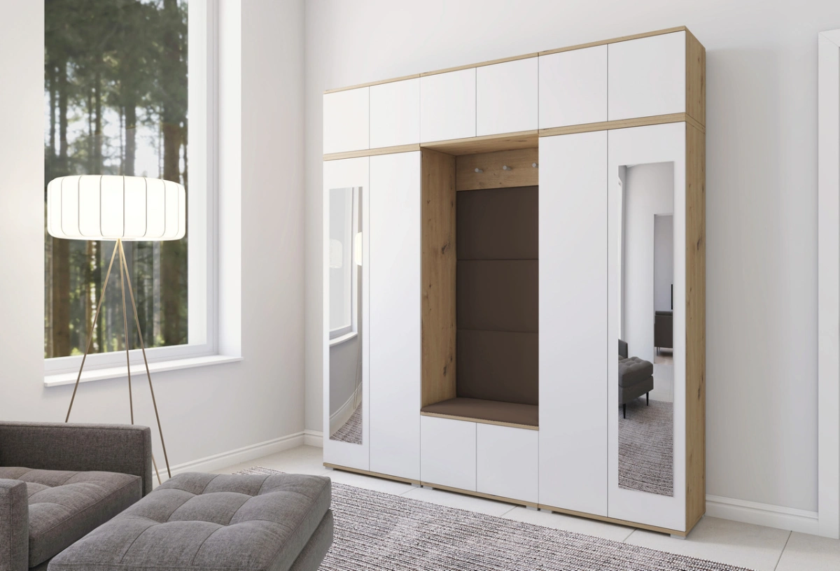 „Sewilla 4“ apmuštą spintą sudaro dvi 70 cm spintos + du prailginimai, prie sienos tvirtinama spintelė, 70 cm batų spintelė, paltų kabykla ir apmuštos panelės: