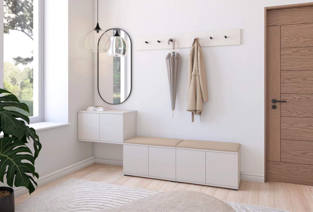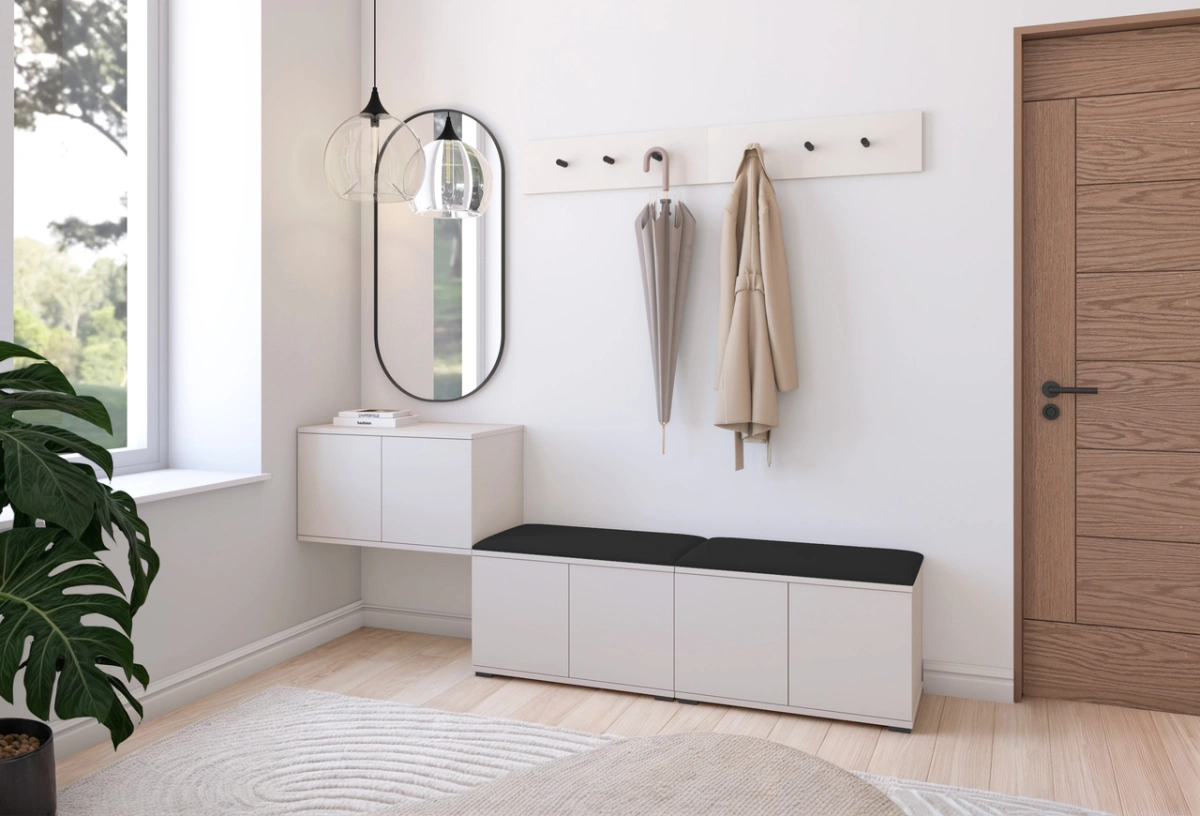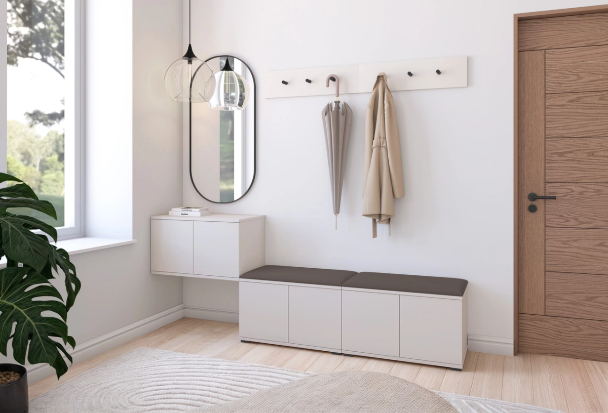 „Bianko 8“ apmuštoje spintoje yra dvi 70 cm batų spintelės, 70 cm pakabinama spintelė, dvi pakabos su kabliukais ir apmuštos sėdimosios dalys: