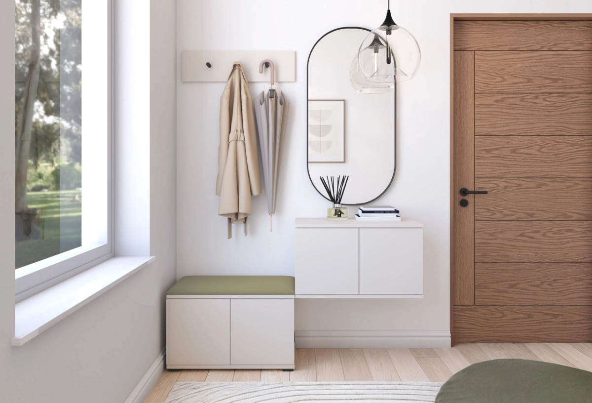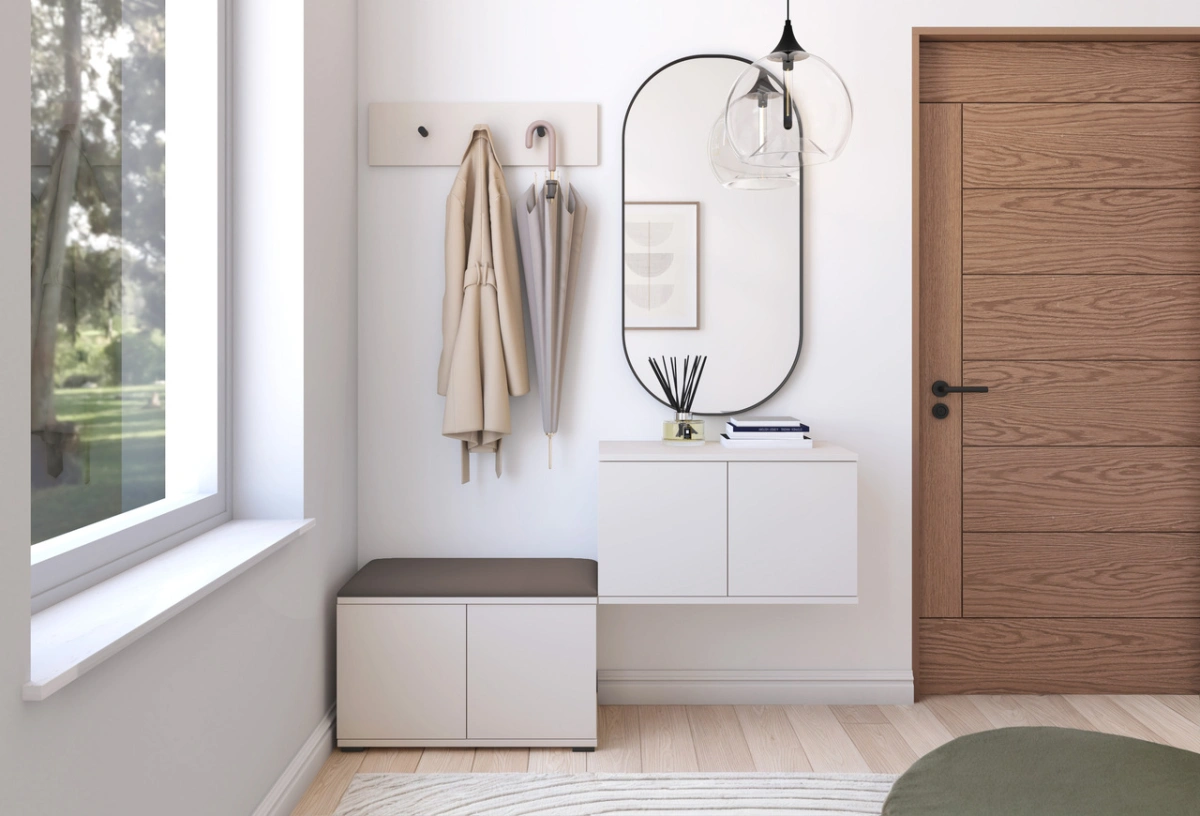 „Bianko 7“ minkštų baldų spinta turi 70 cm batų spintelę, 70 cm pakabinamą spintelę, kabyklą su kabliukais ir minkštą sėdynės panelę: