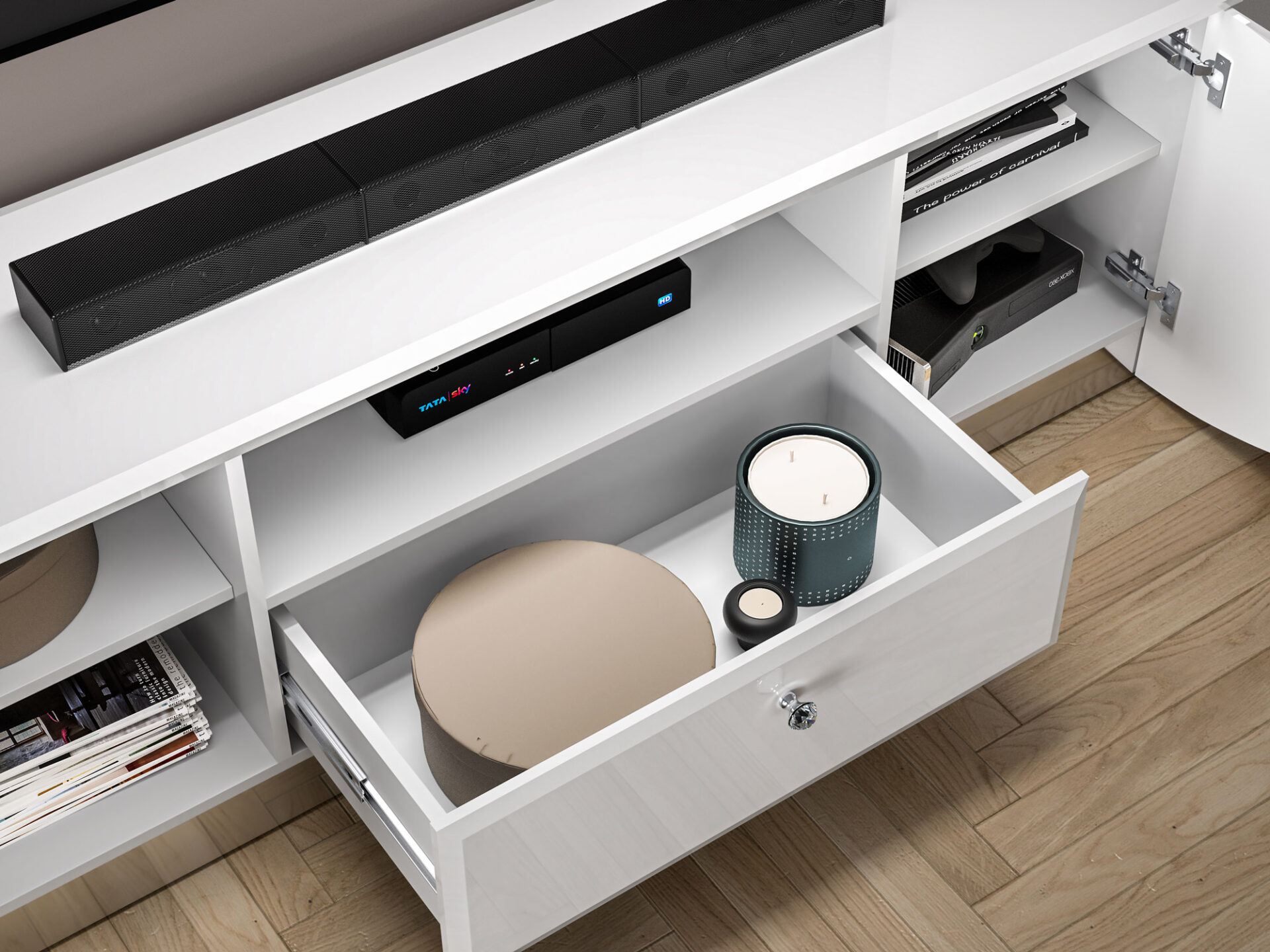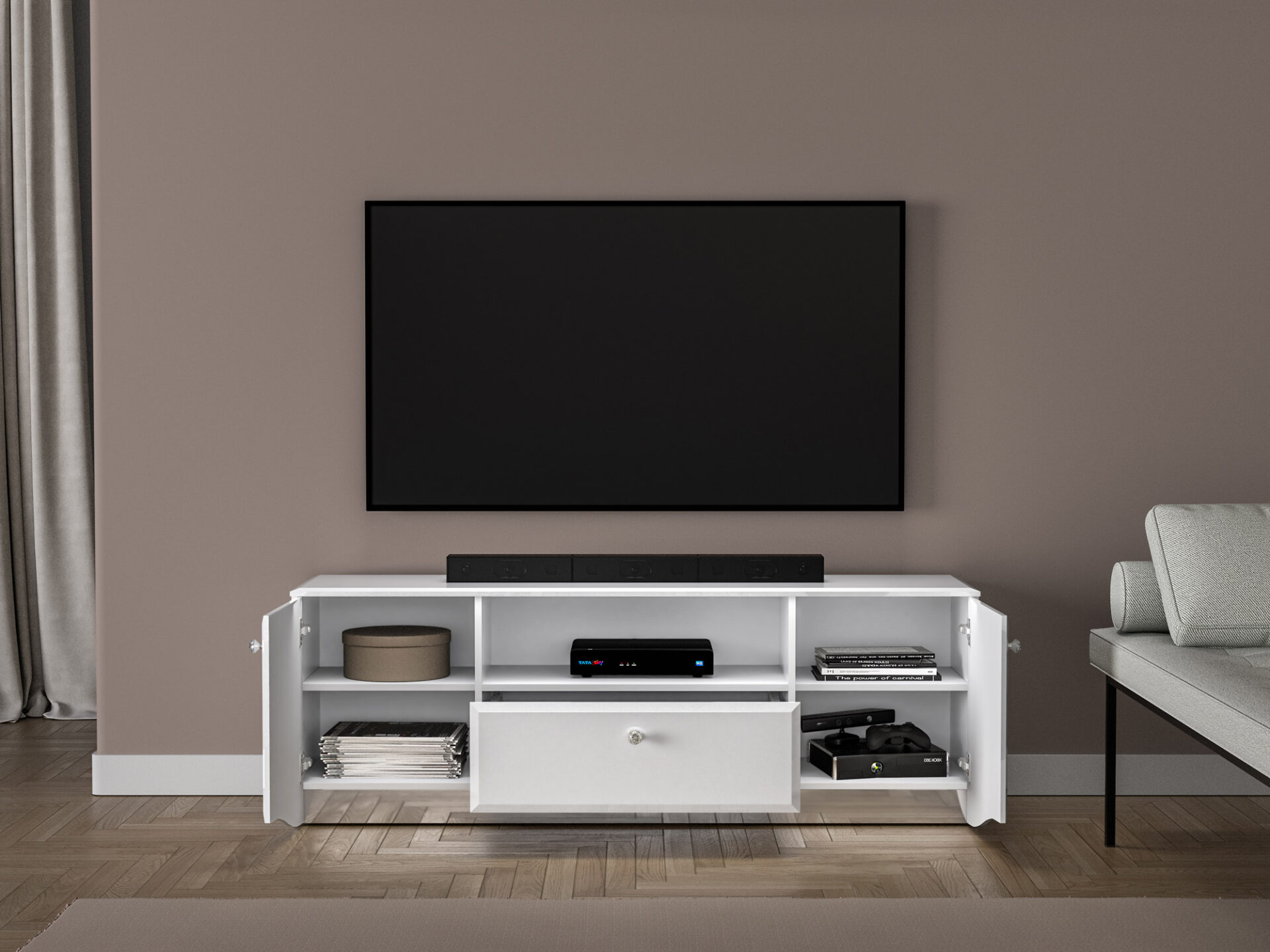 Dėl savo erdvumo stovas puikiai tinka televizoriaus ar konsolės priedams laikyti.
