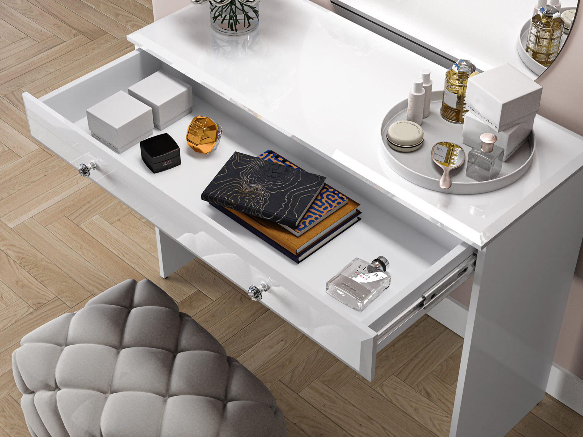 Kiekvienai moderniai ir nepriklausomai moteriai reikia savo erdvės grožiui ir makiažui. Mūsų kosmetinis staliukas GLAMOUR 05-01 buvo sukurtas būtent šiam poreikiui patenkinti.