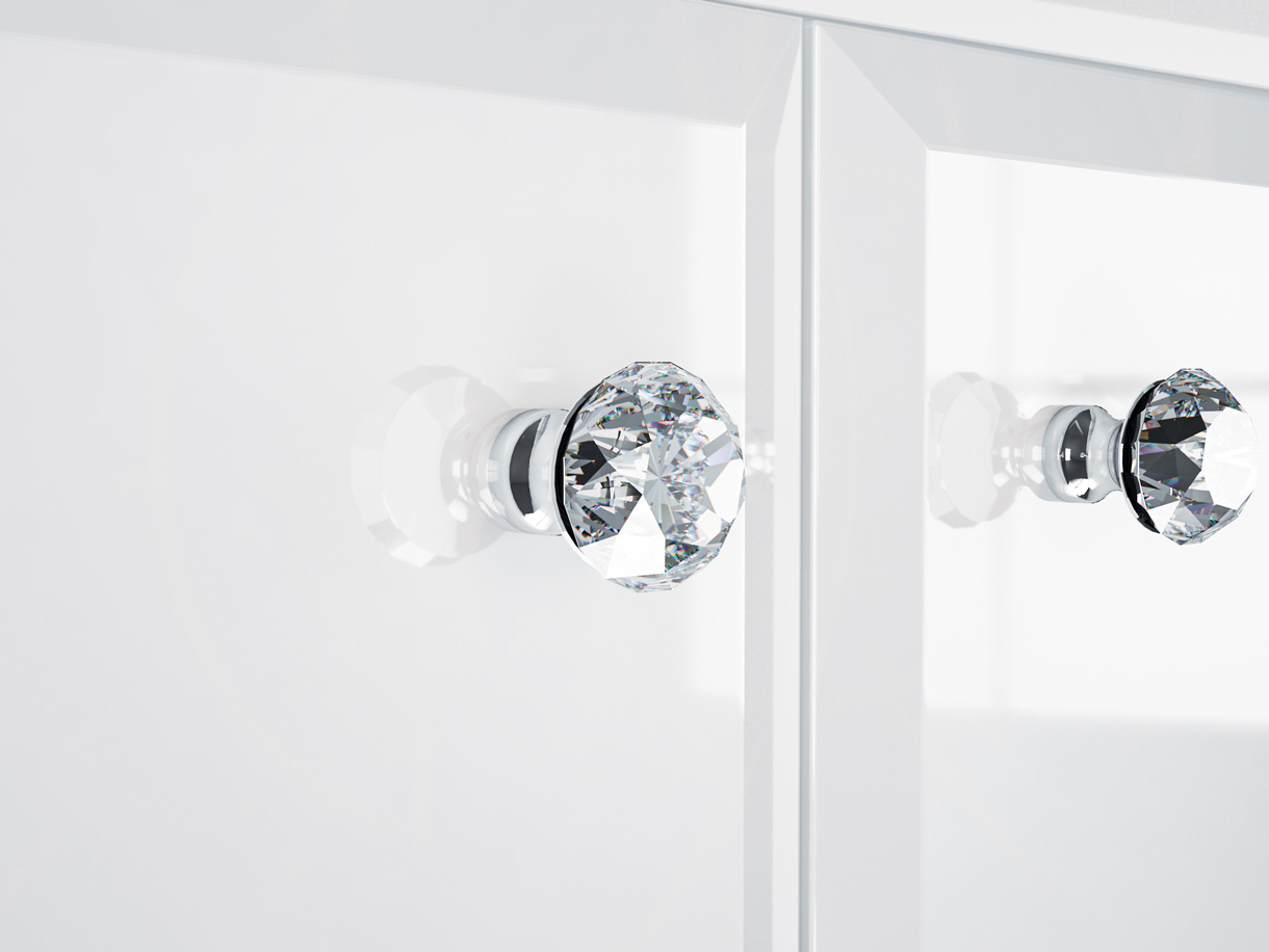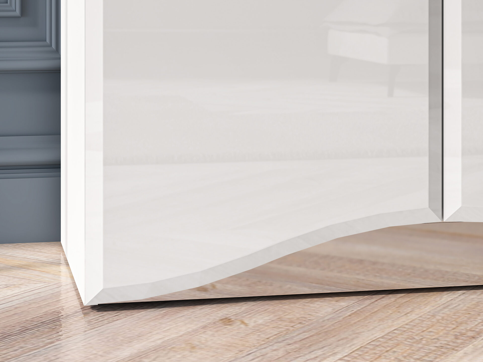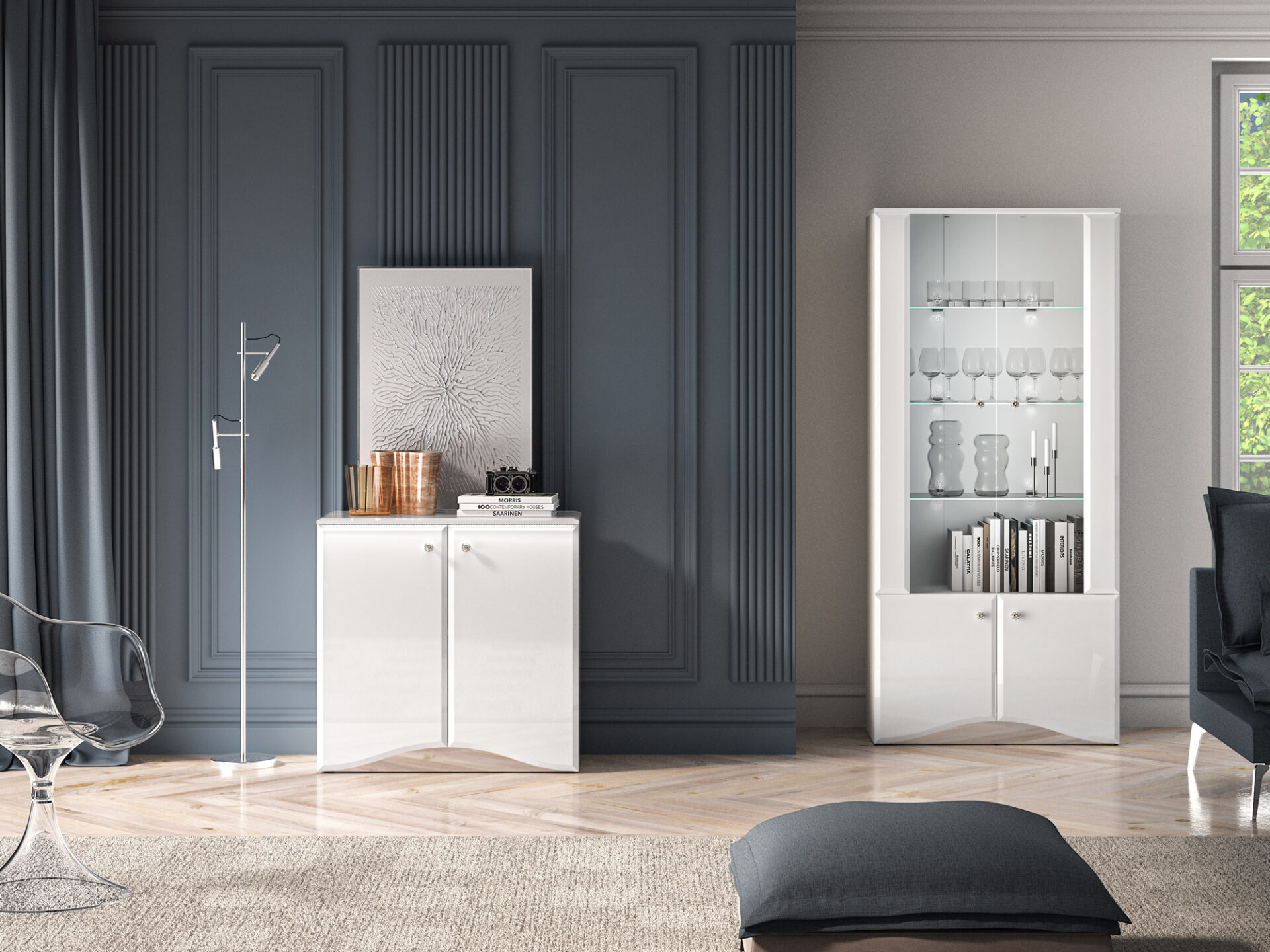 „Glamour 09“ komoda – tai mažas, tačiau labai erdvus baldas, kuris puikiai tiks stilingoje svetainėje arba įspūdingame miegamajame. Spintelę sudaro dvi didelės nišos, kuriose galite lengvai laikyti staltieses, patalynę ar kitus namų tekstilės gaminius. Elegantiškos dvigubos durys užbaigia dizainą ir suteikia visam baldui charakterio. Viršutinėje panelėje yra LED apšvietimas, kuris apšviečia fasadus ir pabrėžia elegantišką frezavimą.