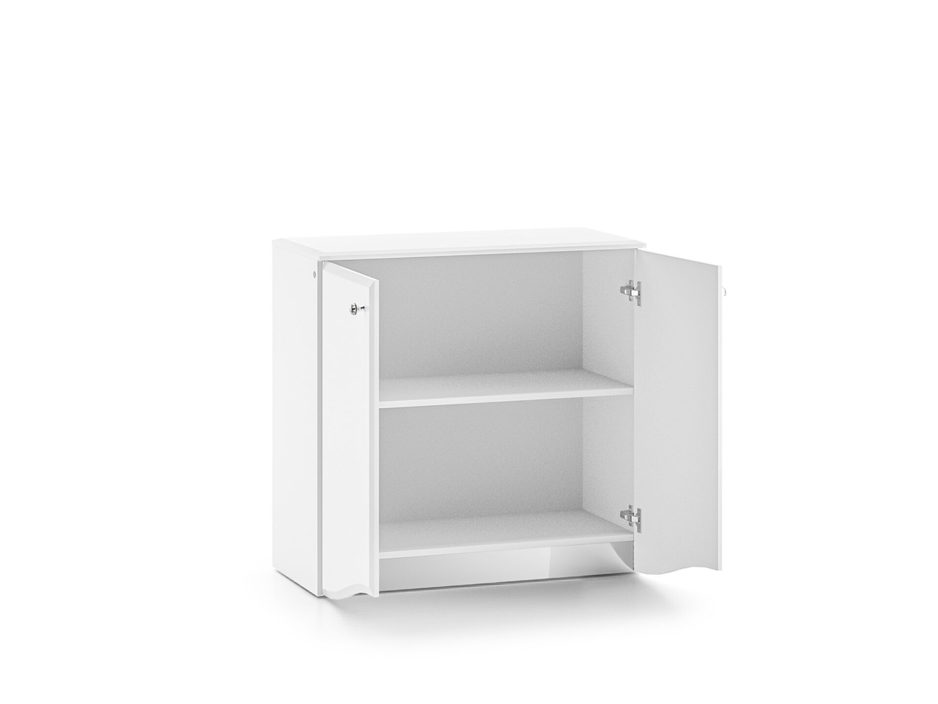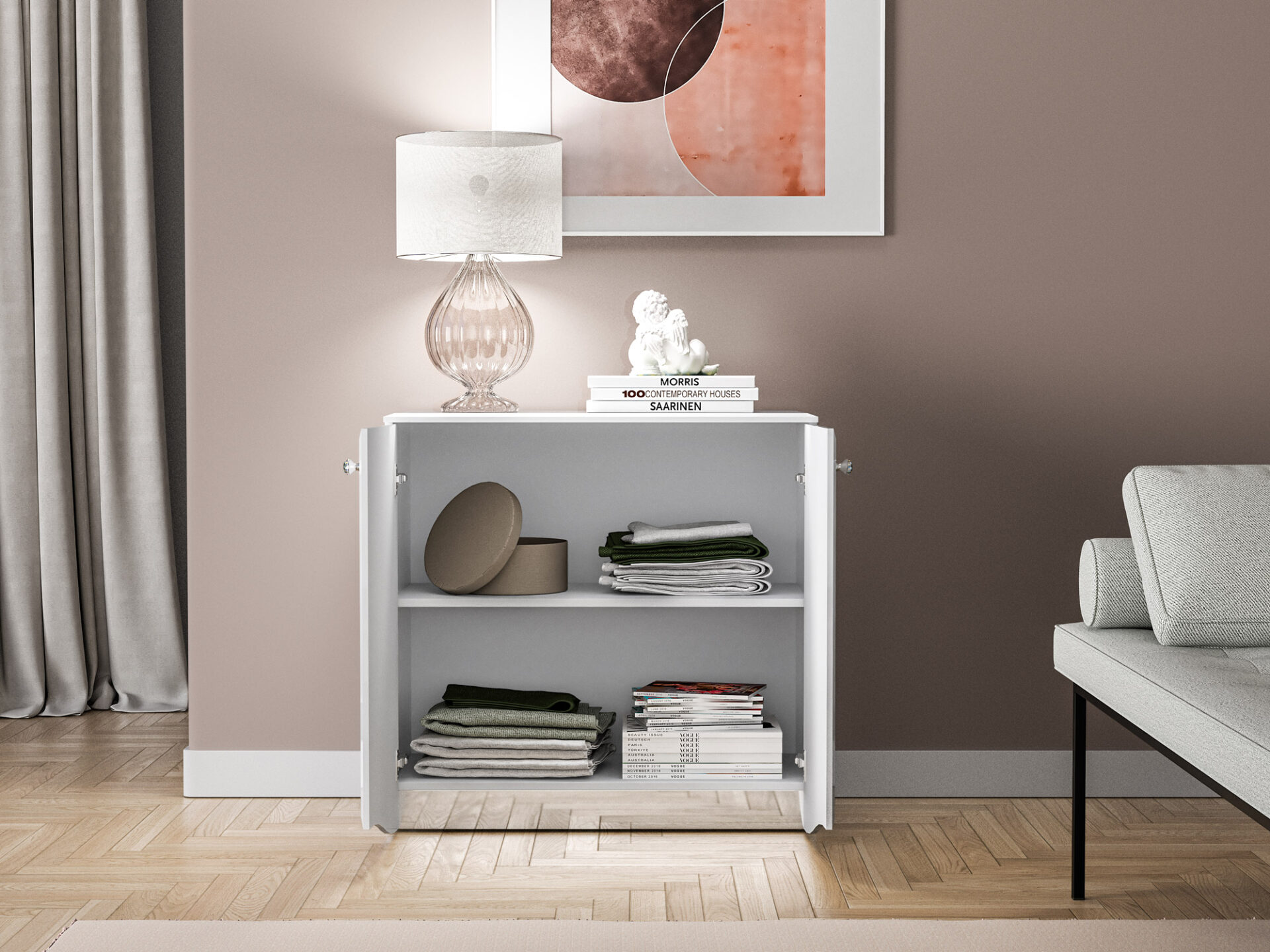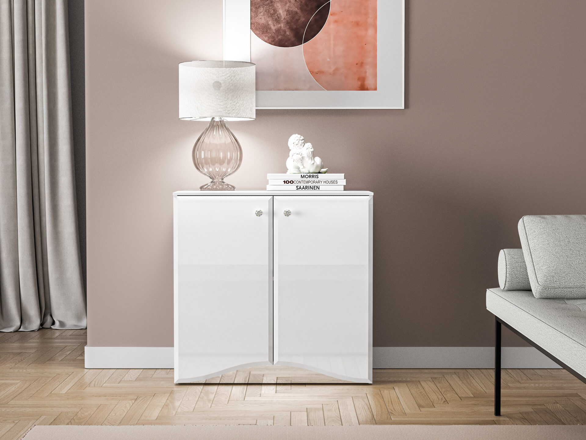 „Glamour 09“ komoda – tai mažas, tačiau labai erdvus baldas, kuris puikiai tiks stilingoje svetainėje arba įspūdingame miegamajame. Spintelę sudaro dvi didelės nišos, kuriose galite lengvai laikyti staltieses, patalynę ar kitus namų tekstilės gaminius. Elegantiškos dvigubos durys užbaigia dizainą ir suteikia visam baldui charakterio. Viršutinėje panelėje yra LED apšvietimas, kuris apšviečia fasadus ir pabrėžia elegantišką frezavimą.