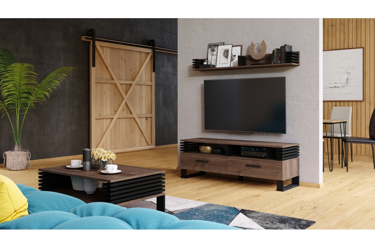 PLOTIS 145 cm, GYLIS 20 cm, AUKŠTIS 17 cm, MEDŽIAGOS Medžio drožlių plokštė, PAVIRŠIUS Matinis, STILIUS Modernus / Loftas, SVORIS SU PAKUOTE 8,6 kg, KITA Produktas skirtas savarankiškam surinkimui su pateiktomis instrukcijomis