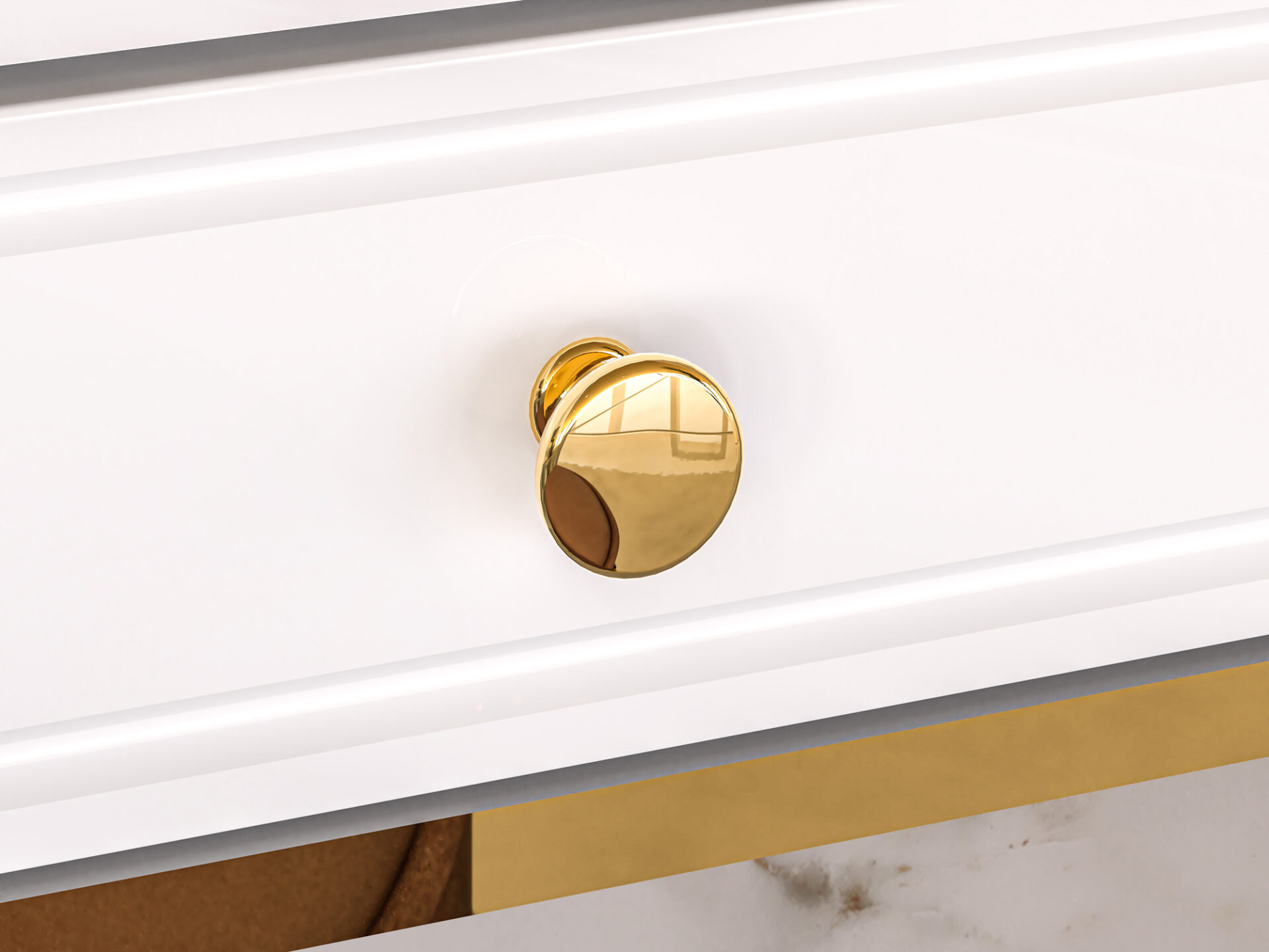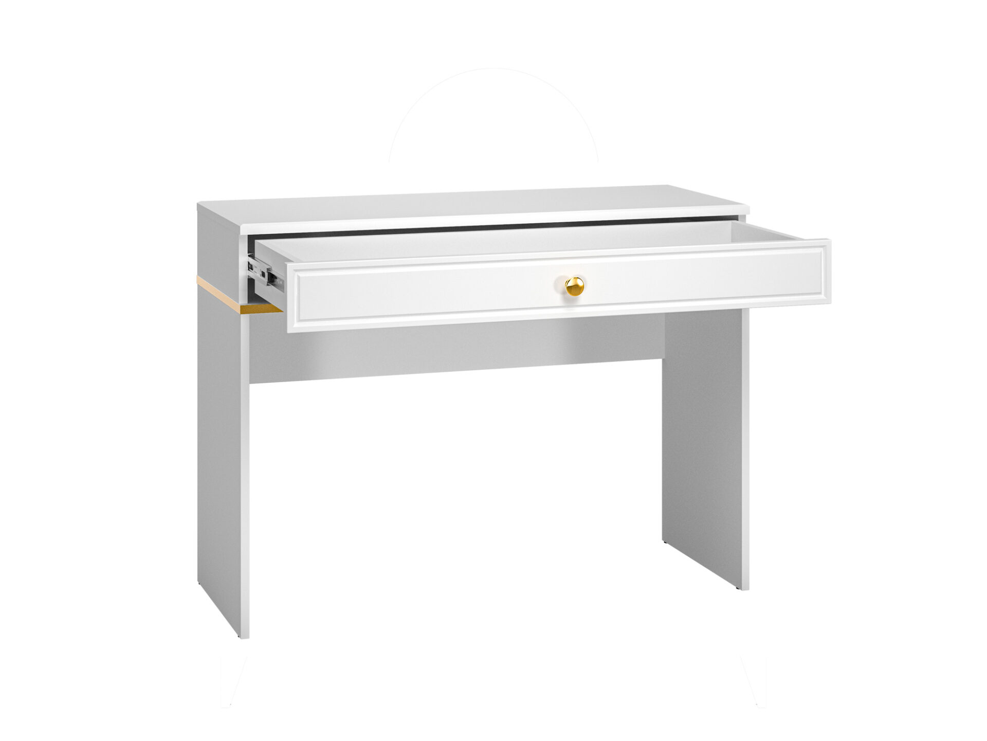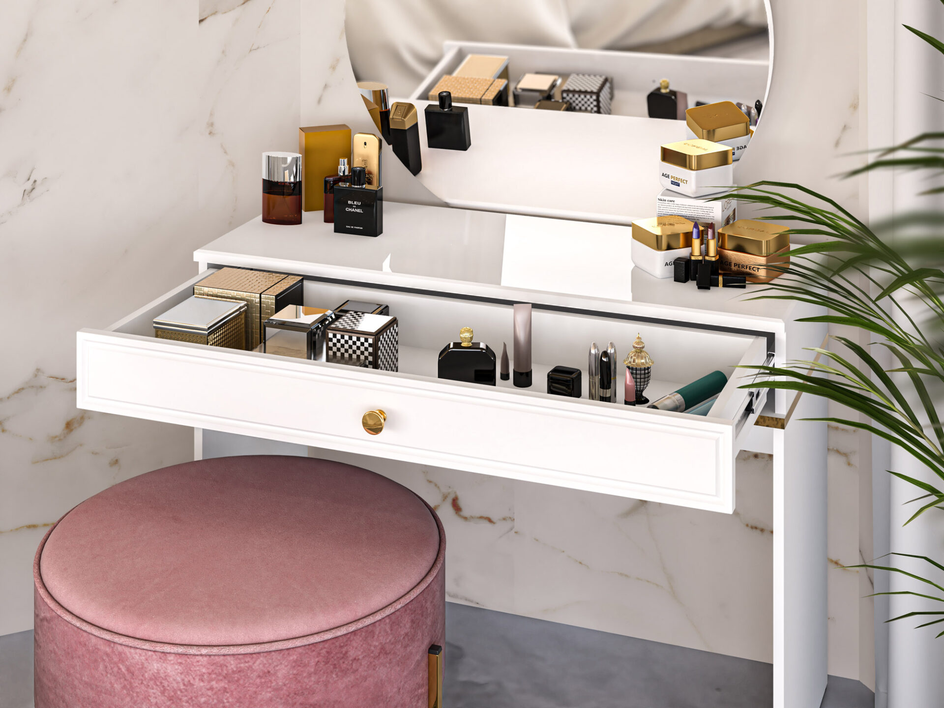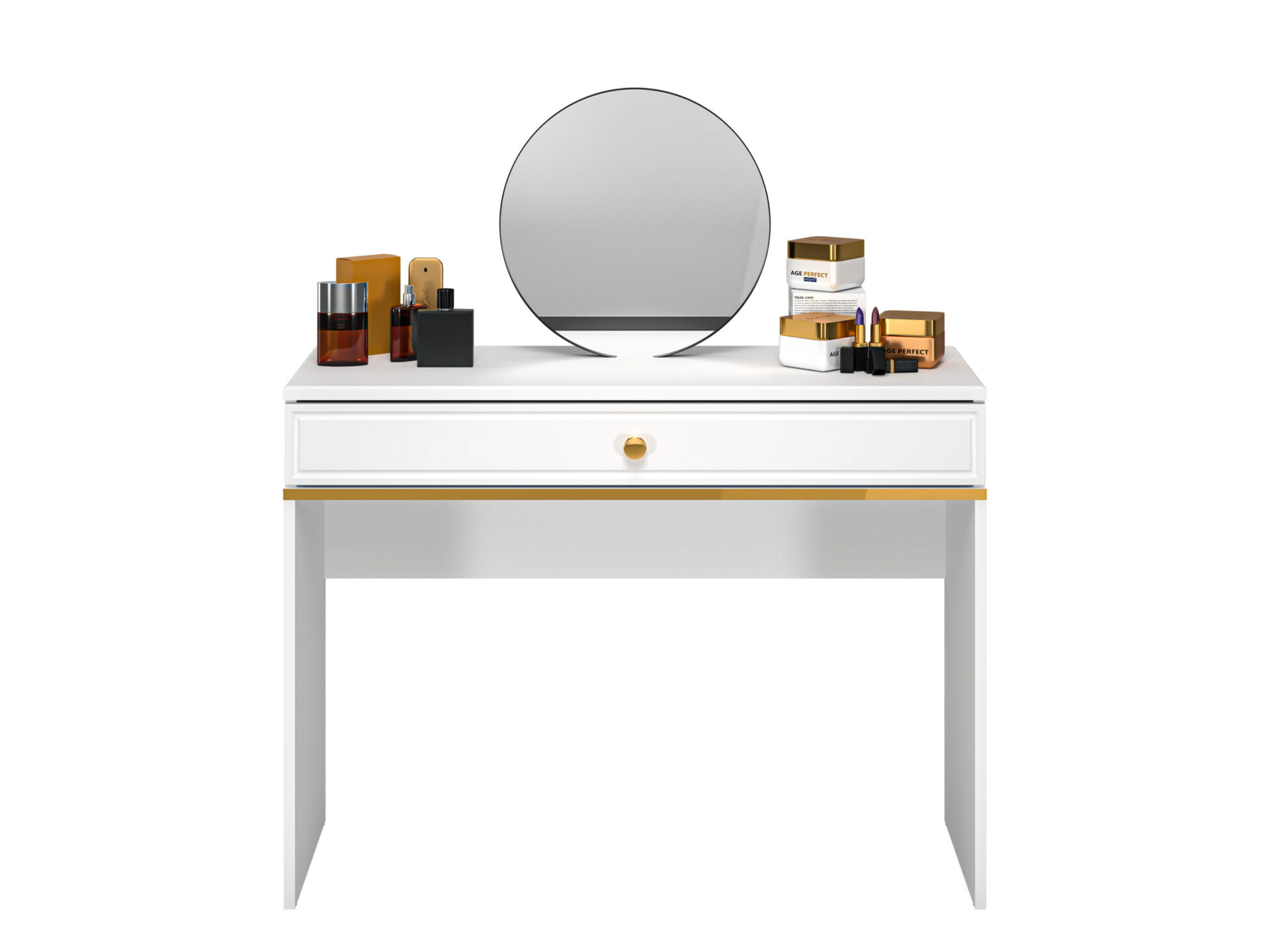 „Goldin 10“ tualetinis staliukas – gražus ir funkcionalus baldas jūsų svajonių miegamajam. Elegantiškas baltas dizainas su auksiniais, brangakmenius primenančiais elementais puikiai tinka makiažui ar vakarinei odos priežiūrai. Po plačiu stalviršiu, puikiai tinkančiu kvepalams ar mėgstamoms gėlėms eksponuoti, slypi erdvus stalčius. Čia laikykite kosmetiką ar kitus smulkius daiktus, palaikydami tvarką savo erdvėje. „Goldin 10“ taip pat gali būti naudojamas kaip konsolinis staliukas arba mažas rašomasis staliukas.