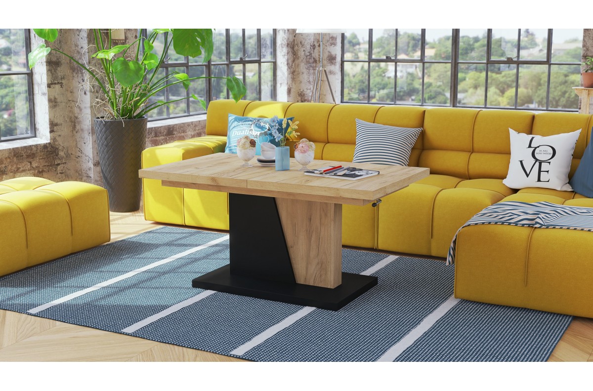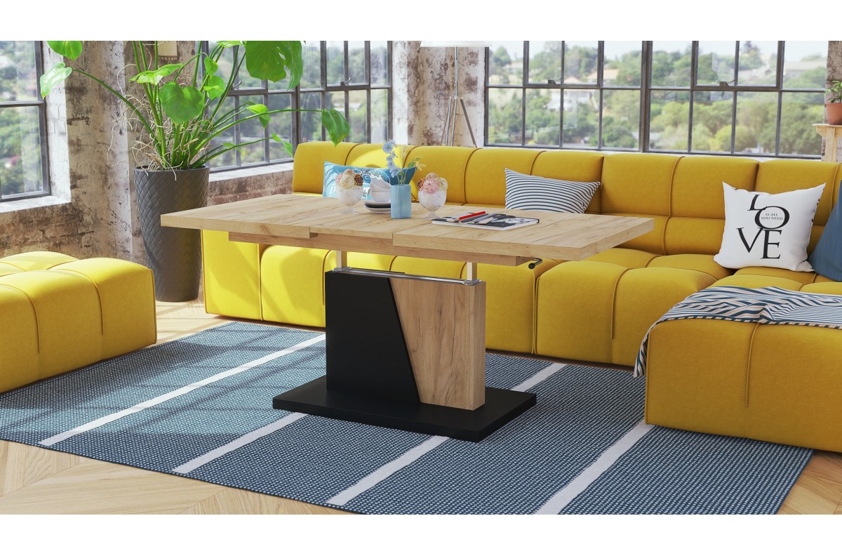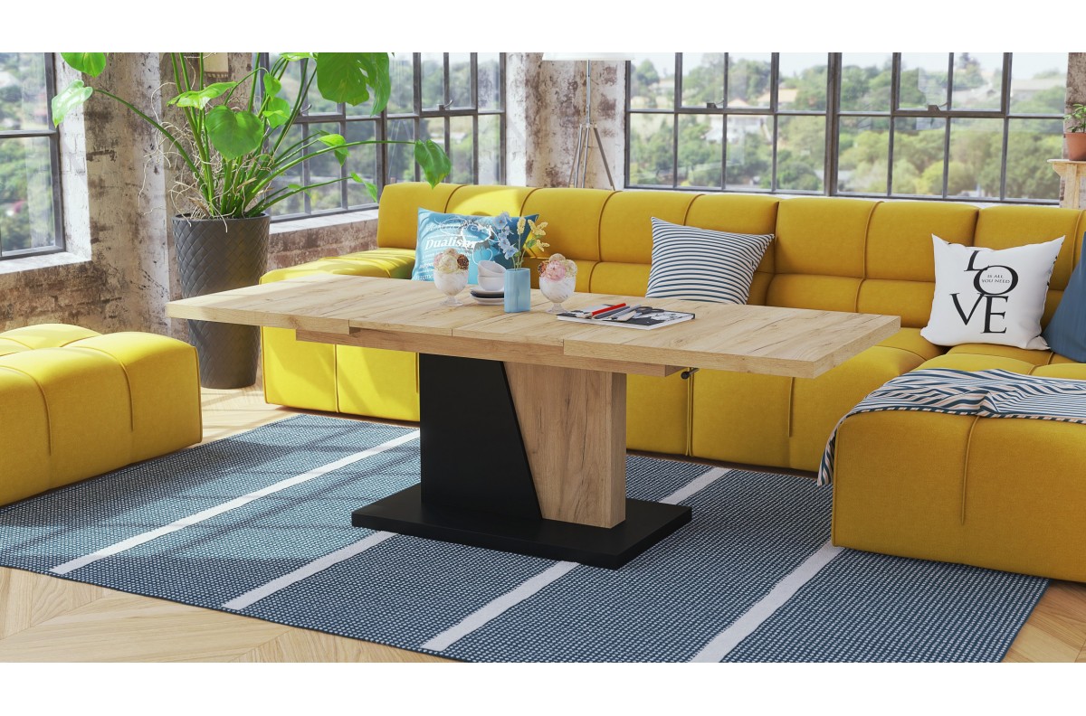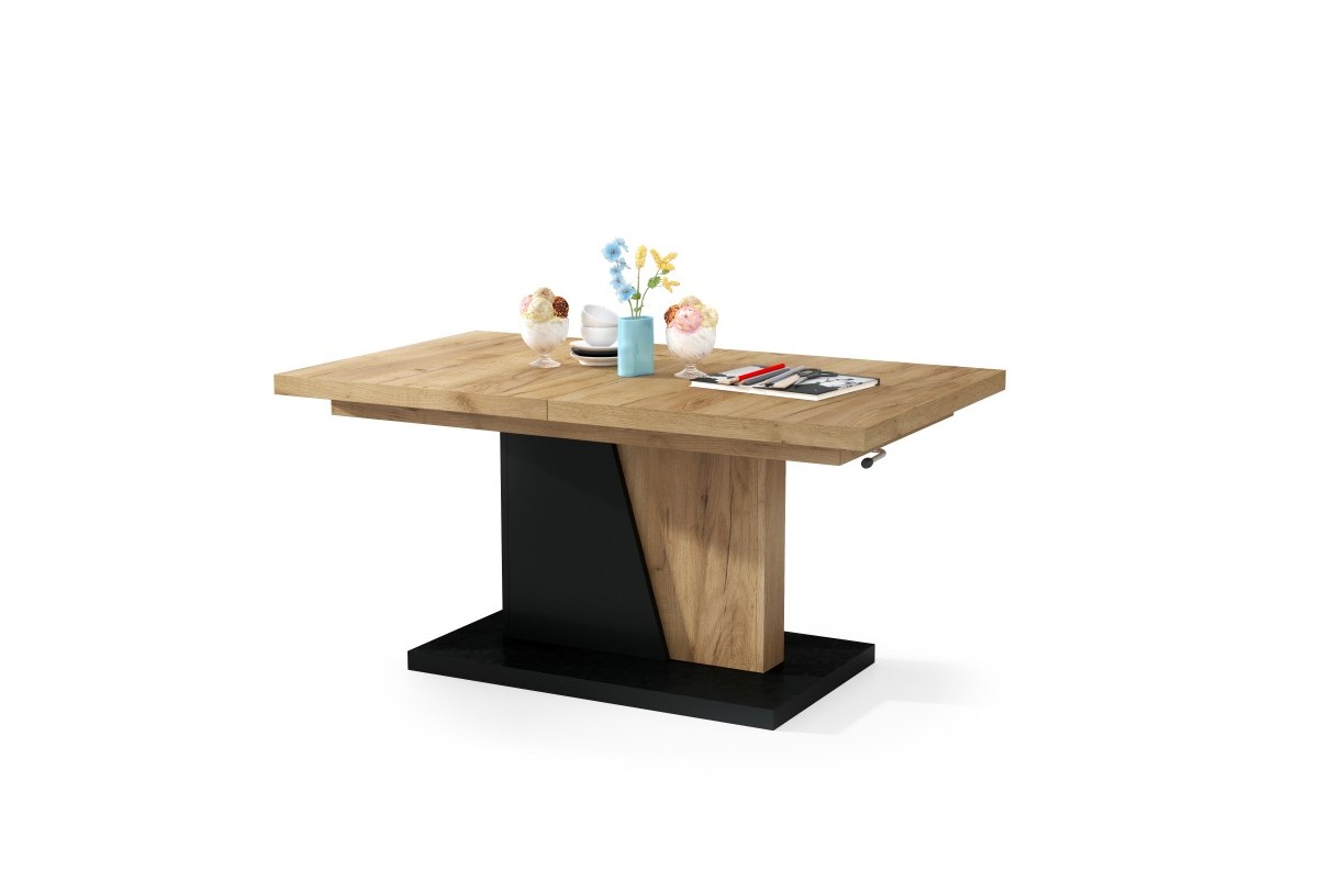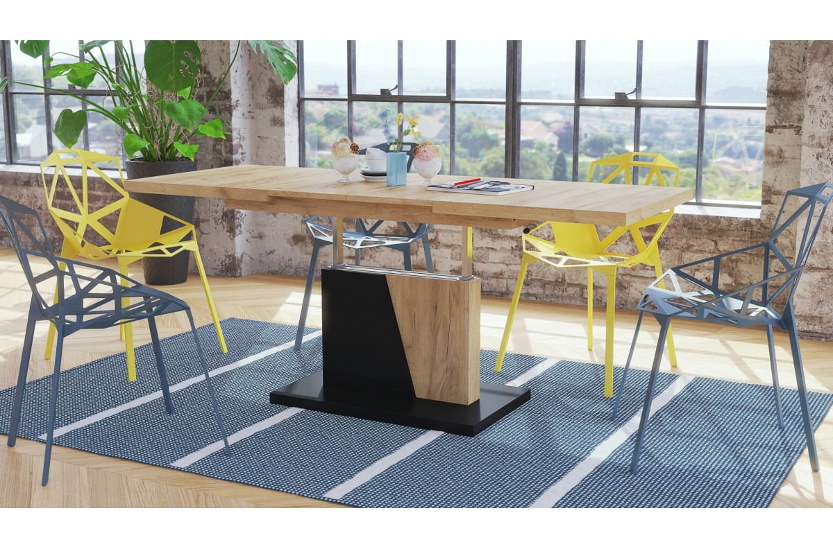 GRAND NOIR Craft ąžuolo, auksinės/juodos spalvos – MODERNUS IŠPLĖSTAMASIS PAKELIAMAS SUOLIO STALAS