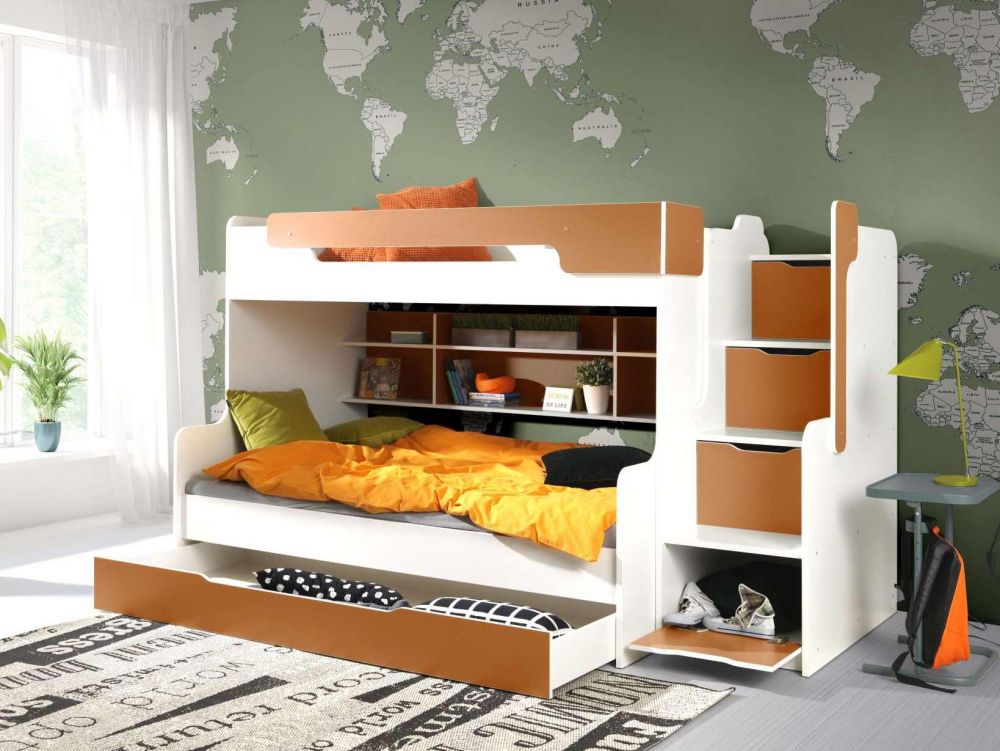 HARRY dviaukštė lova su lentynomis, 2 asmenims, baltai oranžinė 90×200 cm
