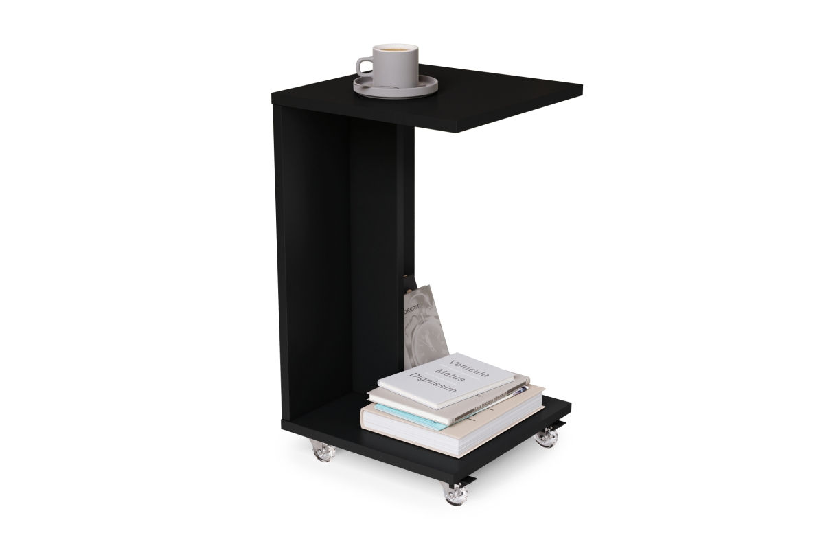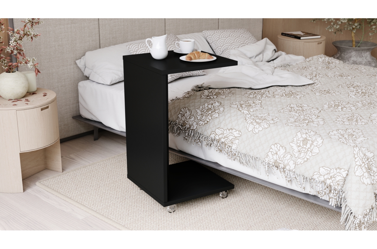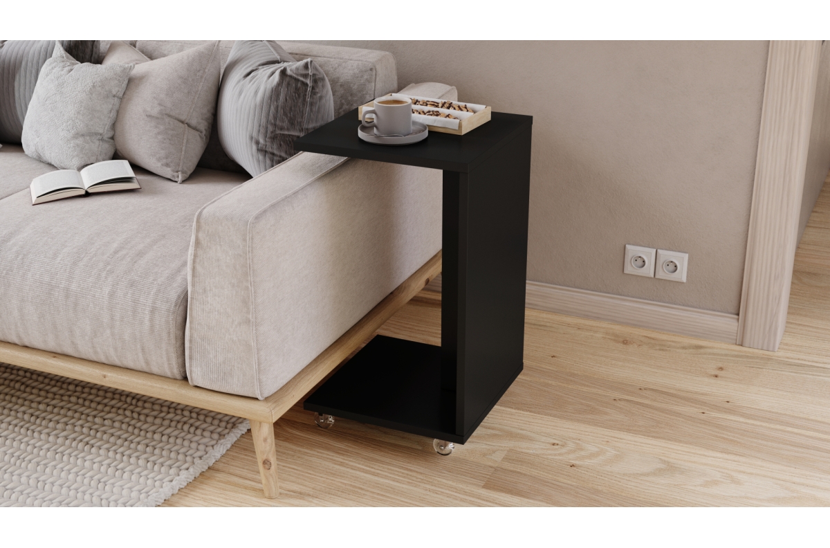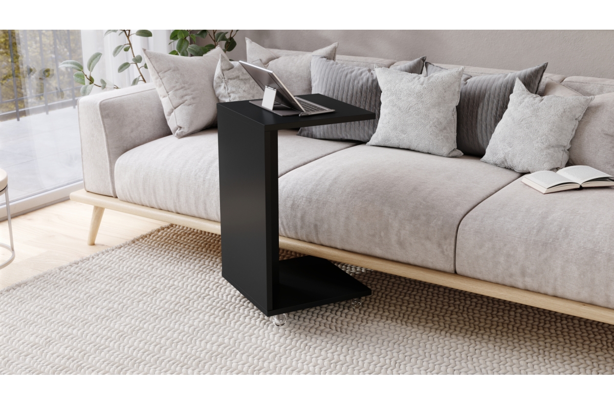 HUGO matinės juodos spalvos – 2 viename šoninis staliukas ant ratukų/kojų – mobilus šoninis staliukas svetainei/miegamajam/vaikų kambariui