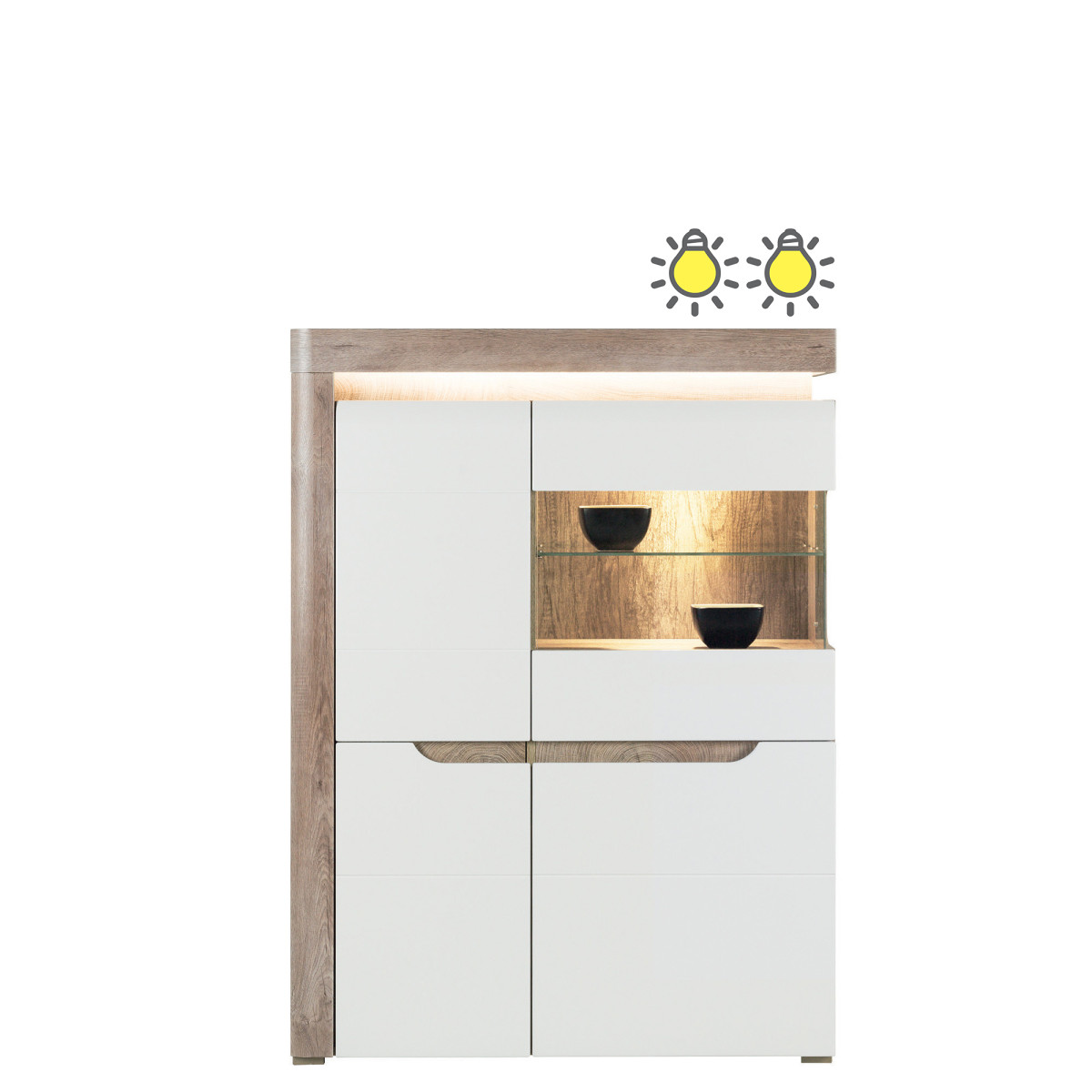 Komoda IRMA IM04 – elegantiškas ir žavus dizaino elementas, puikiai tinkantis svetainei ar moderniam miegamajam. Uždarame skyriuje yra erdvus stalčius ir lentynos, todėl patogu susitvarkyti būtiniausius daiktus, o viršutinė lentyna puikiai tinka šeimos suvenyrams ir niekučiams eksponuoti. Komoda turi švelniai užsidarantį durelių sistemą ir energiją taupantį šaltai baltą LED apšvietimą viršutinėje panelėje. Ryškūs frezuoti fasadai, pakeičiantys tradicines rankenas, paryškina bendrą komodos stilių. Klasikinis matinės ir blizgios baltos spalvų derinys puikiai papildo dabartines tendencijas, suteikdamas komodai neįtikėtino žavesio ir gaivumo, o atspindinti šviesa suteikia interjerui šaunios elegancijos. Galima rinktis iš dviejų standartinių apdailos spalvų – baltos ir Maggia ąžuolo. Komoda puikiai dera su kitais IRMA serijos baldais arba yra atskiras baldas, leidžiantis pritaikyti savo kambario dizainą.