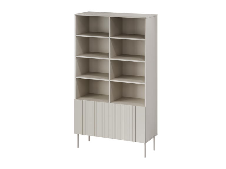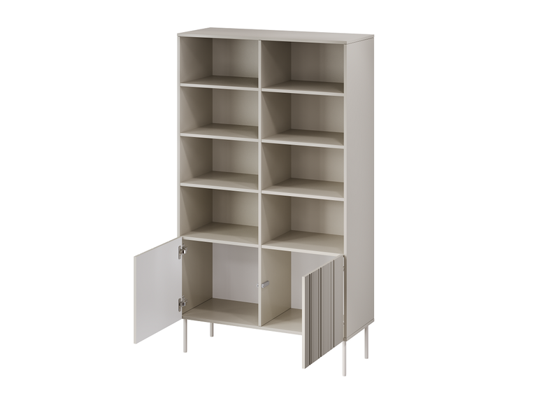 Nuotraukoje pavaizduota lentynų sistema yra modernus, smėlio spalvos baldas, pasižymintis paprastu ir elegantišku dizainu. Joje yra devynios atviros lentynos, puikiai tinkančios knygoms, dekoracijoms ar organizatoriams eksponuoti. Apatinėje dalyje yra užrakinama spintelė su dviem durelėmis, kurioje galite laikyti daiktus, kurių nenorite paslėpti. Plonos kojelės suteikia visai konstrukcijai lengvumo pojūtį, o neutrali spalva leidžia lentynų sistemą lengvai pritaikyti įvairiuose interjeruose – nuo svetainės iki biuro ar paauglio kambario.