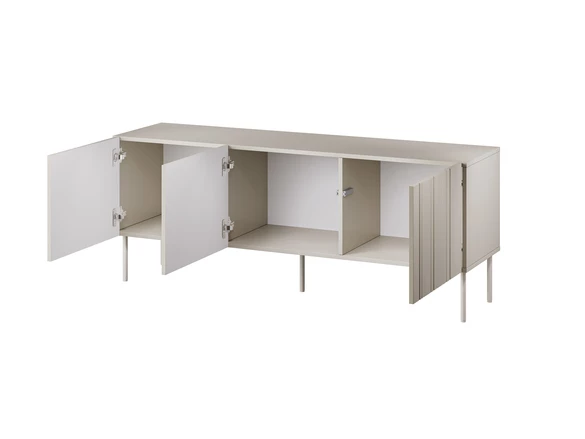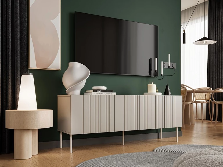 Šis smėlio spalvos televizoriaus staliukas ant aukštų kojelių yra elegantiškas ir modernus pasirinkimas jūsų svetainei. Šis baldas ne tik atlieka praktinę funkciją, leisdamas laikyti elektroniką, bet ir suteikia stiliaus jūsų interjerui.