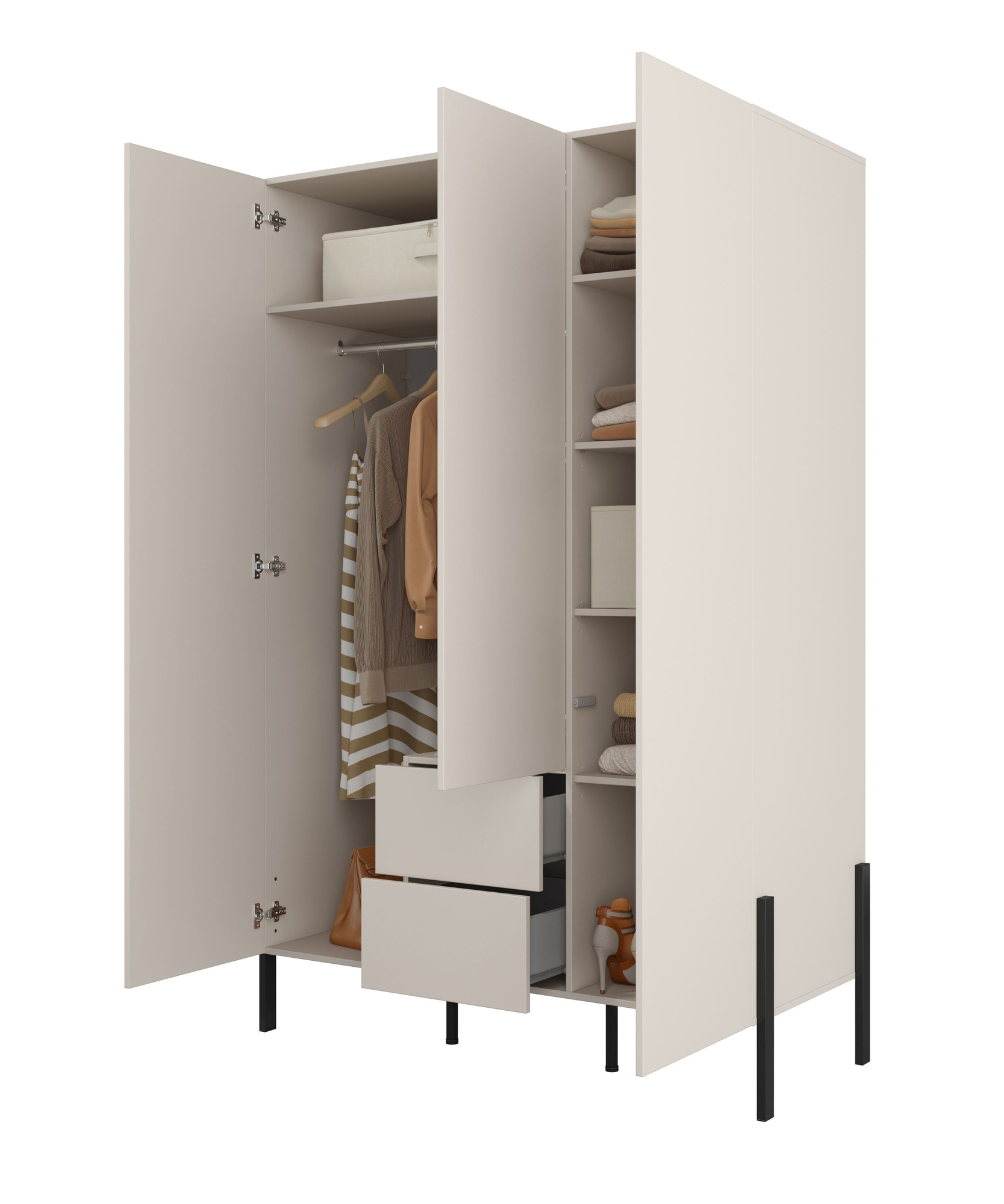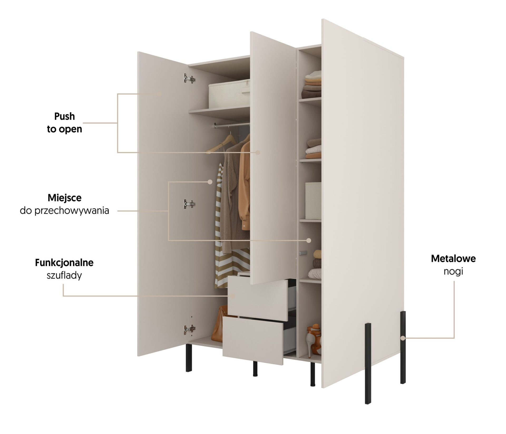 Pristatome „Jukon S – 3D2S“ spintą – puikų sprendimą tiems, kurie vertina eleganciją ir praktiškumą. Jos modernus kašmyro dizainas puikiai dera su šiuolaikinėmis interjero tendencijomis, o juodos metalinės kojelės suteikia jai unikalų charakterį. Šis erdvus modelis, kurio plotis – 135 cm, aukštis – 210 cm, o gylis – 60 cm, tampa ne tik baldu, bet ir dekoratyviniu elementu bet kuriame kambaryje. Universalus kašmyro derinys su modernistiniu juodų kojelių akcentu leidžia „Jukon S“ spintą lengvai pritaikyti prie įvairių interjero stilių – nuo skandinaviško iki industrinio. Minimalistinė išvaizda leidžia sukurti harmoningą erdvę, kurioje kiekvienas elementas dera tarpusavyje, sukurdamas estetiškai patrauklią visumą. Spintos funkcionalumas taip pat nusipelno ypatingo dėmesio. Be gausios daiktų laikymo vietos, kiekviena detalė buvo kruopščiai apgalvota kasdieniam naudojimui. Atidarymo spustelėjus sistema leidžia atidaryti duris be rankenėlių, išlaikant švarias linijas ir modernų baldo vaizdą. Tai leidžia kasdien naudotis spinta patogiai ir intuityviai.