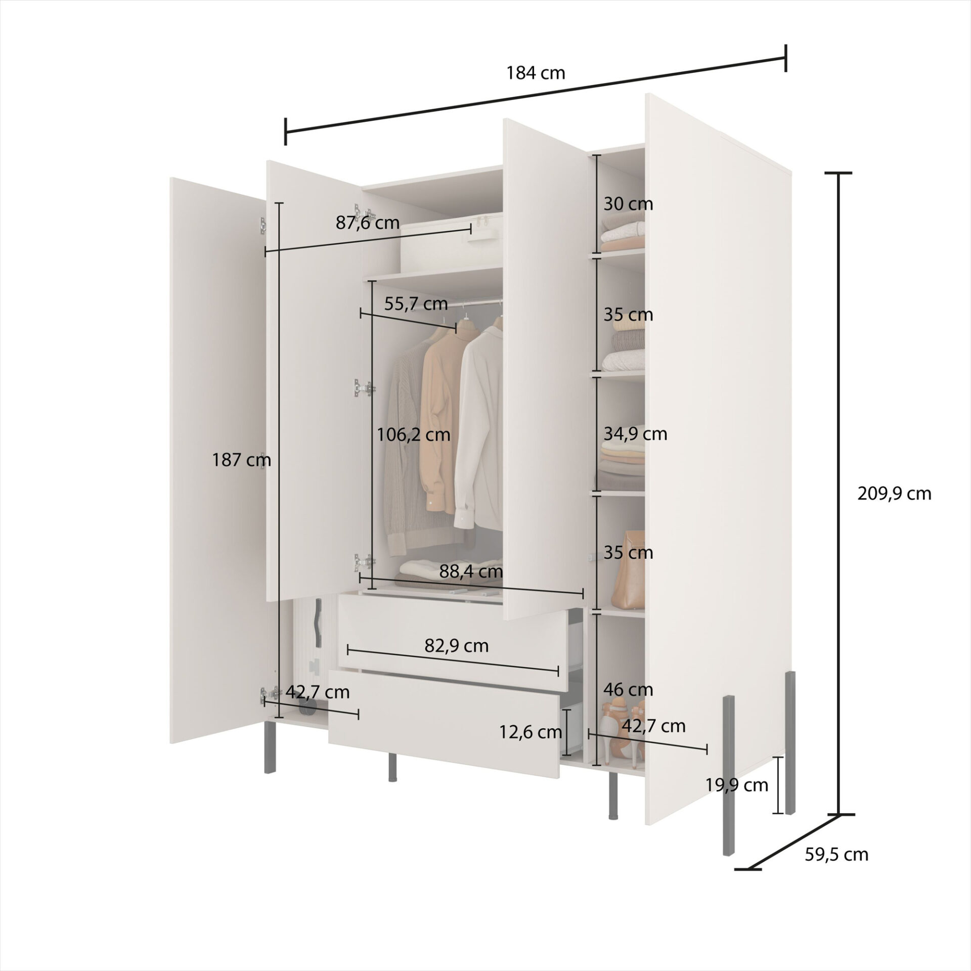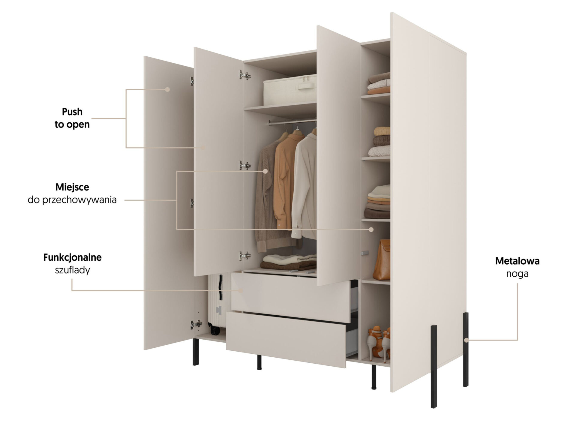 Atraskite eleganciją ir funkcionalumą, sujungtą „Helvetia“ spintoje „Jukon S“. Patraukli kašmyro spalva kartu su moderniomis, juodomis metalinėmis kojelėmis suteikia klasės bet kokiam interjerui. Tai puikus sprendimas tiems, kurie vertina estetikos ir praktiškumo harmoniją. Dėl gerai apgalvoto dizaino ši keturių durų spinta taps jūsų miegamojo ar prieškambario širdimi. „Jukon S“ spintos vidus suteikia erdvės ir tvarkos. Išmanus lentynų ir daiktadėžių išdėstymas leis puikiai sutvarkyti visus jūsų drabužius. Paspaudus atidarymo sistemą durys atidaromos patogiai ir tyliai, o tai žymiai pagerina kasdienio naudojimo komfortą. Mėgaukitės lengvu priėjimu prie savo daiktų bet kuriuo metu. Investuodami į „Jukon S“ spintą, įsigyjate baldą, kuris puikiai atitinka šiuolaikines dizaino tendencijas. Minimalistinė forma ir subtilus kašmyro atspalvis puikiai dera su įvairiais interjero dizaino stiliais – nuo skandinaviško, industrinio iki klasikinio. Šis baldas ne tik atlieka savo paskirtį, bet ir pagerina erdvę.