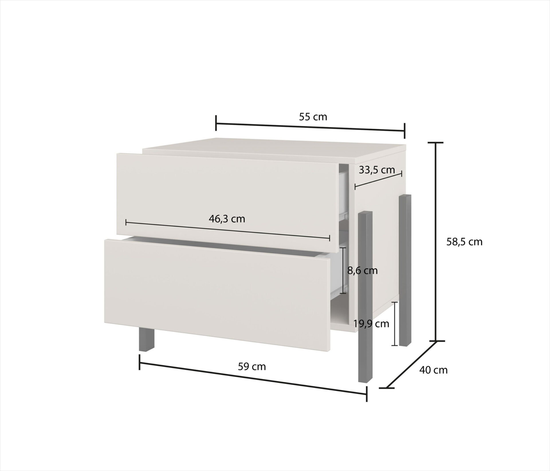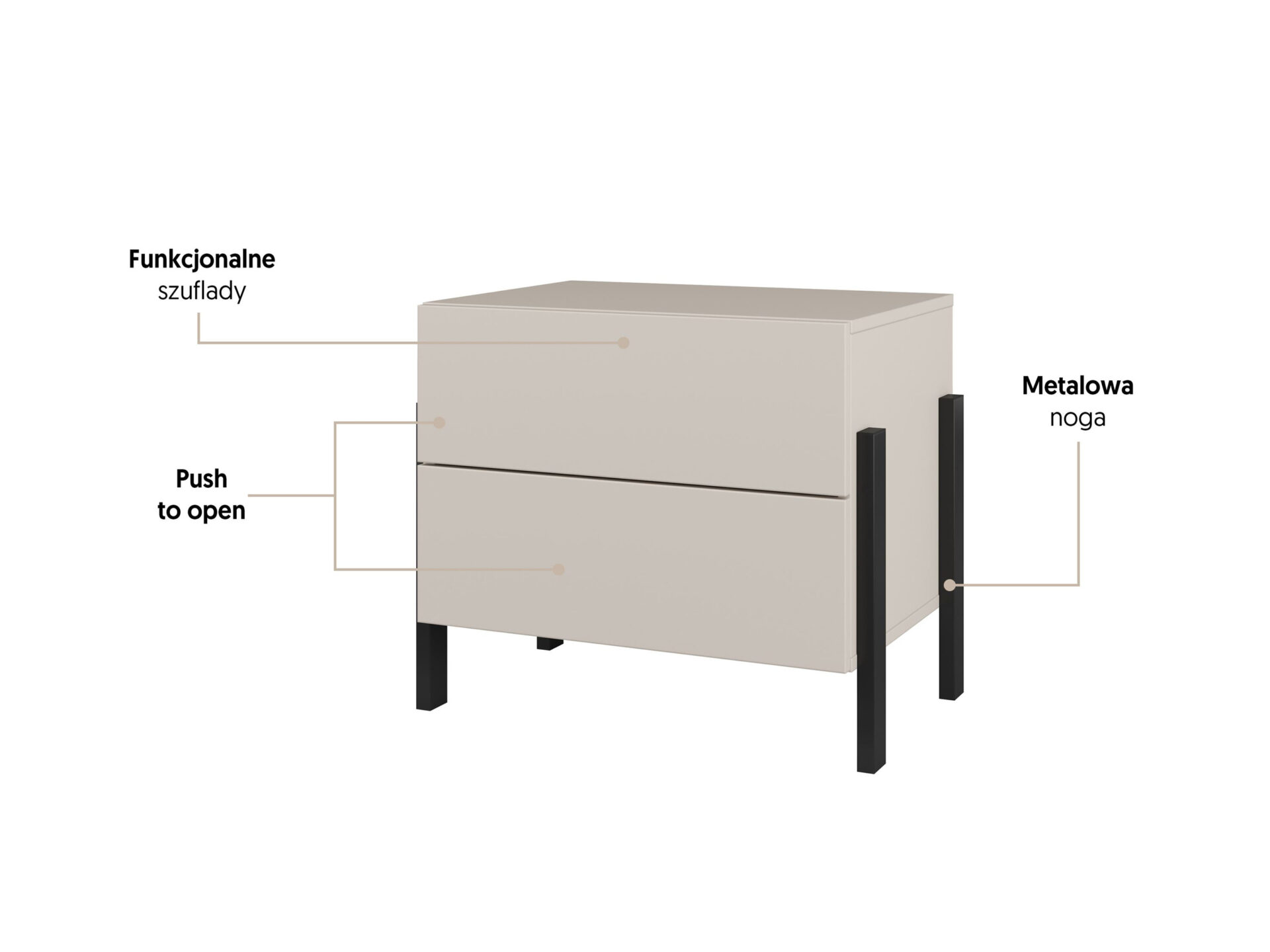 Atraskite „Jukon S – 2S“ naktinio stalelio žavesį ir modernumą, kuris puikiai papildys jūsų interjerą. Elegantiška kašmyro spalva suteikia subtilumo, o minimalistinis dizainas paverčia naktinį staliuką ne tik baldu, bet ir stilingu aksesuaru. Matinės juodos metalinės kojelės kontrastuoja su maloniu korpuso atspalviu, tikrai patraukdamos kiekvieno svečio akį. Šis naktinis staliukas derina estetiką ir funkcionalumą – praktiškas išdėstymas su dviem stalčiais leidžia laikyti būtiniausius daiktus lengvai pasiekiamu atstumu. Paspaudus atidaroma sistema leidžia ne tik lengvai, bet ir maloniai patekti į vidų. Atsisveikinkite su negražiomis rankenėlėmis – modernus mechanizmas suteikia lengvumo ir elegancijos. Nekantraujate paversti savo miegamąjį ramybės oaze? „Jukon S“ suteiks harmonijos ir tvarkos, todėl kiekviena akimirka, praleista su juo, bus dar atpalaiduojanti. Jis taip pat yra puikus dizaino elementas svetainėje ar biure, kur visada trauks dėmesį savo unikaliu stiliumi.