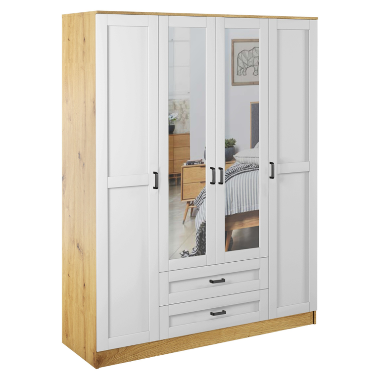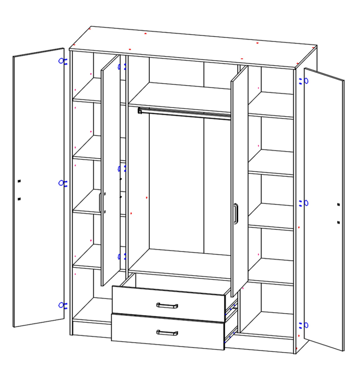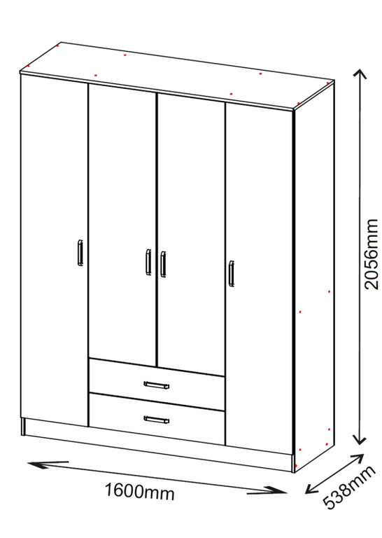 Aukštis cm: 205,6 cm, plotis cm: 160 cm, gylis cm: 53,8 cm, durų tipas: atidaromos, durelių skaičius: 4, stalčių skaičius: 2, veidrodžiai: taip, savaiminis surinkimas: taip