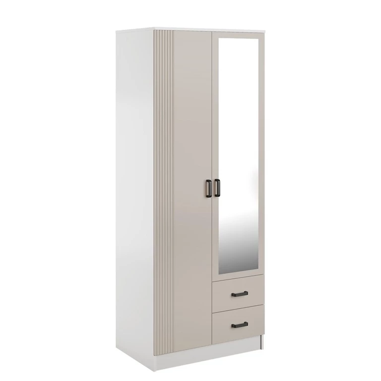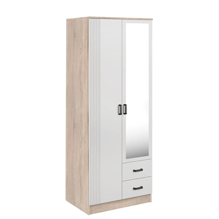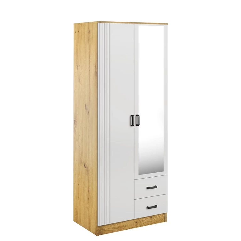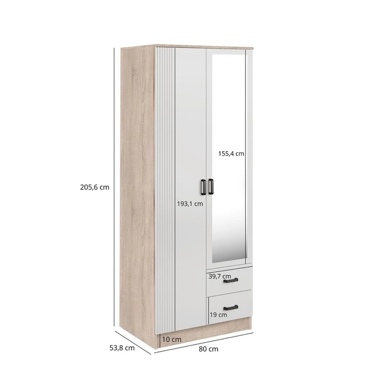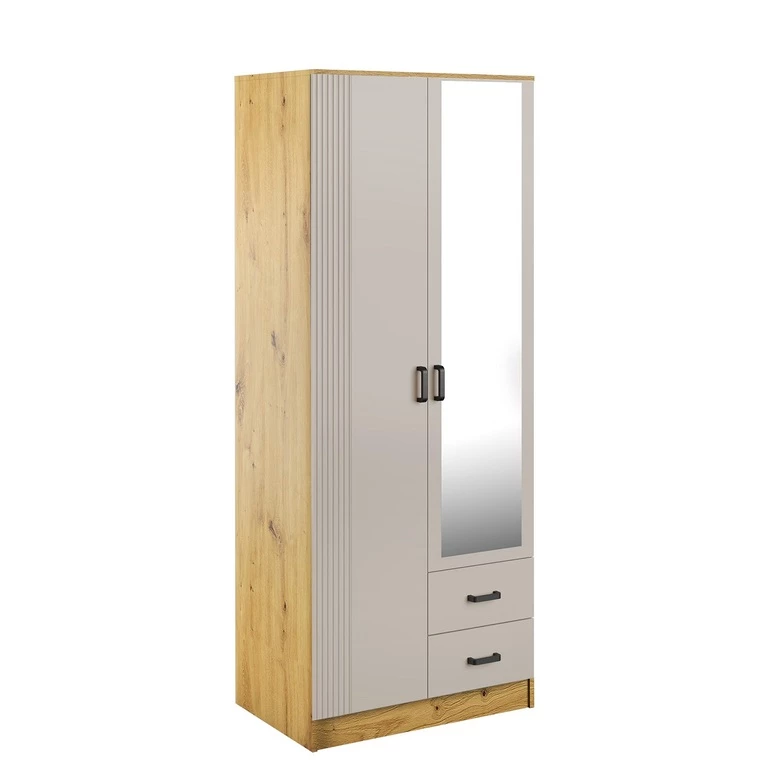 Ši dviejų durų spinta pasižymi elegantiškais, grioveliais fasadais, veidrodžiu ir dviem praktiškais stalčiais.