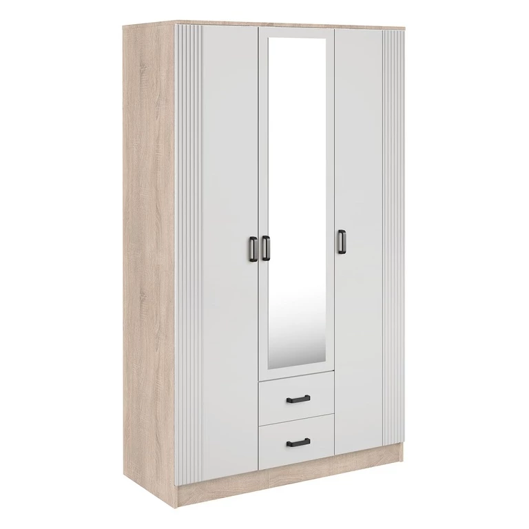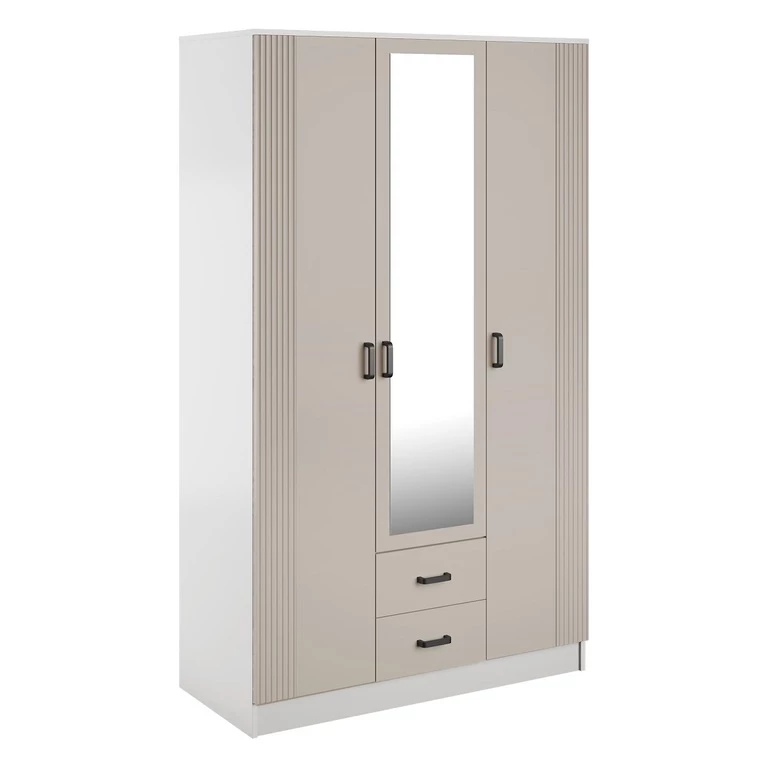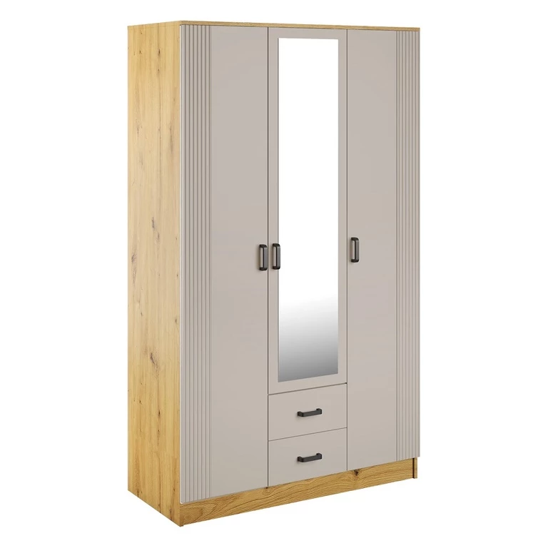 Ši trijų durų spinta pasižymi elegantiškais, grioveliais fasadais, veidrodžiu ir dviem praktiškais stalčiais.