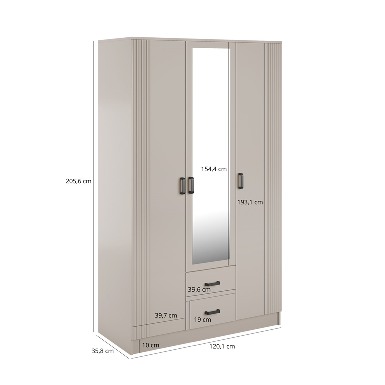 Ši praktiška ir stilinga spinta yra 120 cm pločio, 205,6 cm aukščio ir 53,8 cm gylio. Šis modelis turi tris duris, kurių viduryje yra veidrodis, kuris ne tik vizualiai padidina erdvę, bet ir yra neįtikėtinai funkcionalus kasdieniam naudojimui.