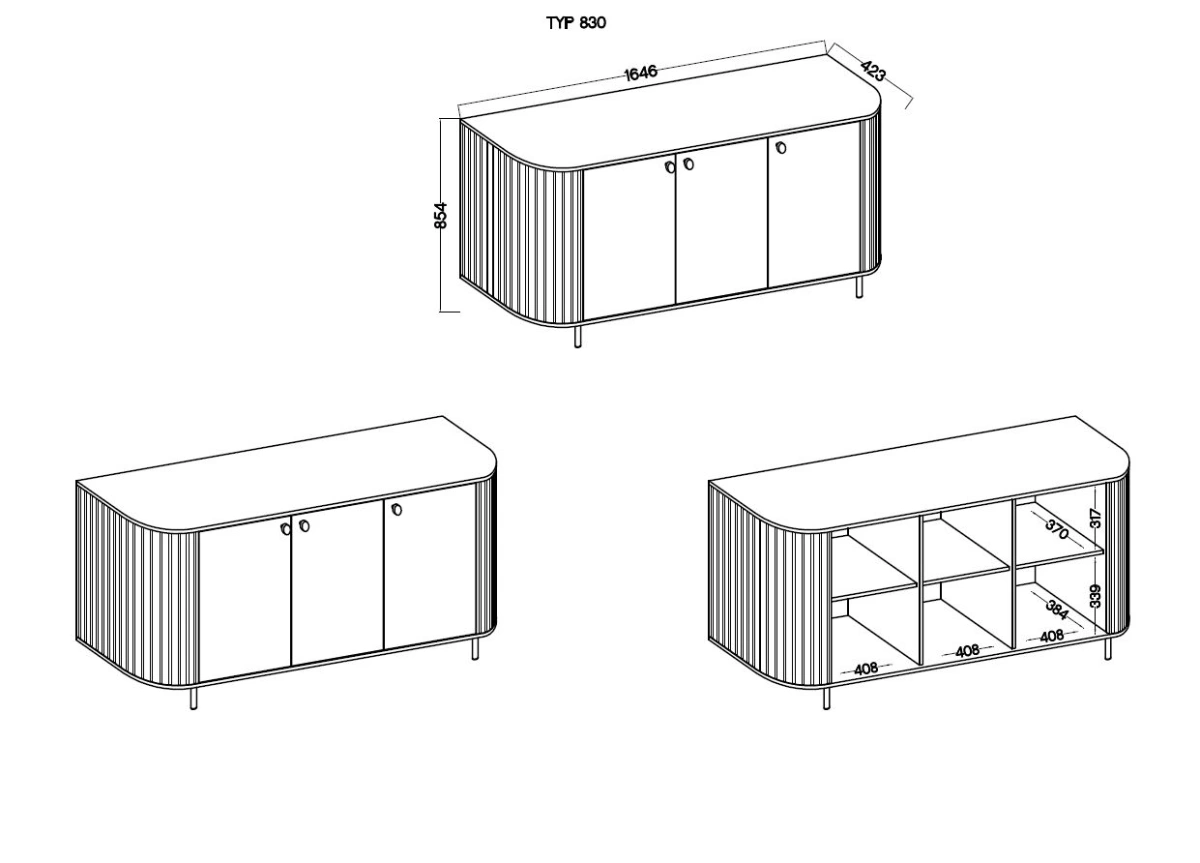 „Ovalio“ komoda – turi tris spinteles su lentynomis už fasadų.