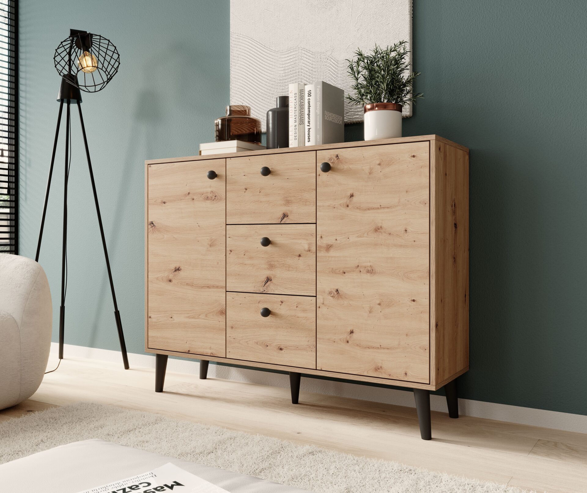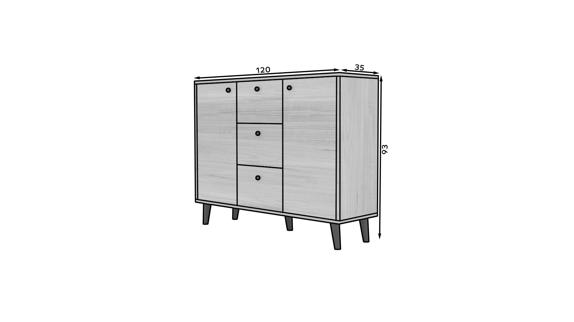 BESA komoda – tai tobulas minimalistinio dizaino ir lengvos formos derinys. Aukštos medinės kojelės suteikia jai žavesio, užtikrindamos stabilią ir tvirtą konstrukciją. Trys erdvūs stalčiai leidžia laikyti smulkius daiktus ar dokumentus, o dvi šoninės spintelės su lentyna viduje suteikia papildomos vietos daiktams susidėti. BESA komoda puikiai tiks jūsų svetainei, miegamajam ar prieškambariui.