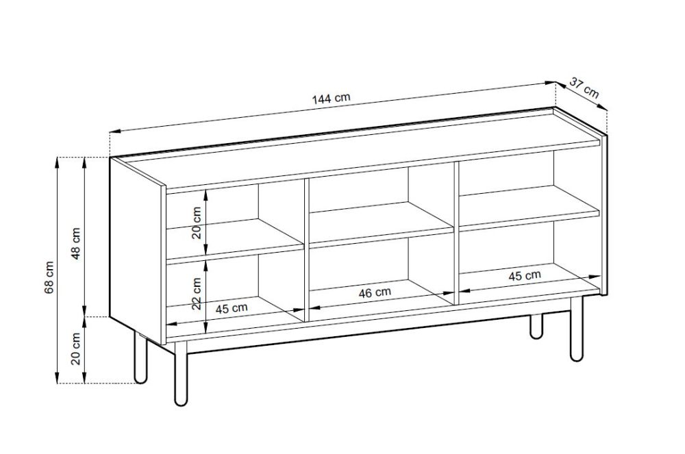 Boho K144/68 komoda – turi tris priekines dalis su lentynomis už jų.