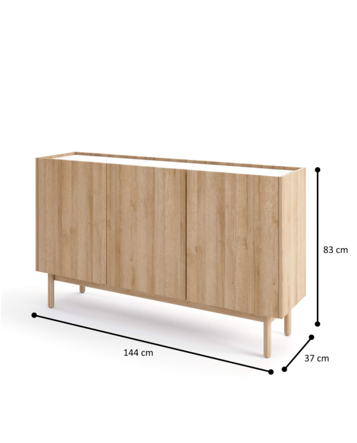 Komoda „Boho K144/83“ pasižymi kombinuota „Riviera Oak“ ir „Bianco“ marmuro apdaila, pastatyta ant nuleisto stalviršio. Šis dizainas suteikia daug vietos mėgstamiems suvenyrams, augalams ir smulkiems daiktams eksponuoti. Spintelė turi tris varstomas duris, už kurių erdvę dalija horizontali lentyna, ir stovi ant aukštų (20 cm) medinių kojelių, leidžiančių naudoti savaeigius dulkių siurblius. Spintelė pagaminta iš laminuotos baldinės plokštės, kuri yra labai atspari įbrėžimams. Komoda yra to paties pavadinimo komplekto, kurį sudaro komodos, naktinis staliukas ir televizoriaus staliukai, dalis. Baldai pristatomi išardyti ir pridedamos aiškios instrukcijos.