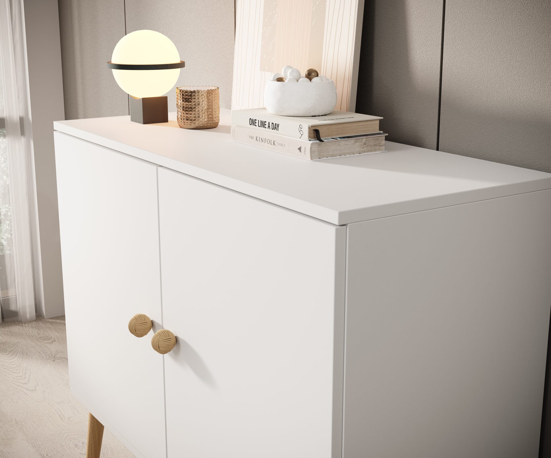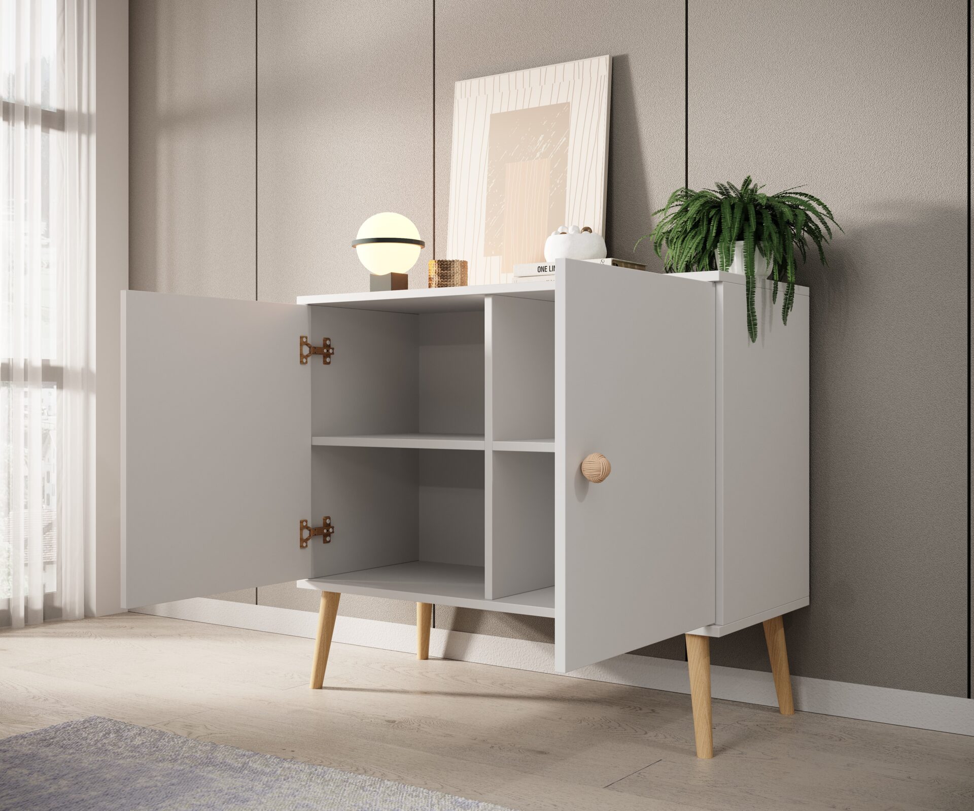 Ši stilinga Deri komoda – puikus sprendimas moderniam interjerui. Minimalistinis dizainas, aukštos medinės kojelės ir virvinės rankenos suteikia jai unikalų charakterį. Dėl švelniai užsidarančių durelių ir reguliuojamų lentynų galite pritaikyti erdvę pagal savo poreikius. Pagaminta iš patvarių, 18 mm storio medžiagų, ji garantuoja tvirtumą ir ilgaamžiškumą. Sukurkite harmoningą išdėstymą, derindami komodą su kitais savo interjero baldais!