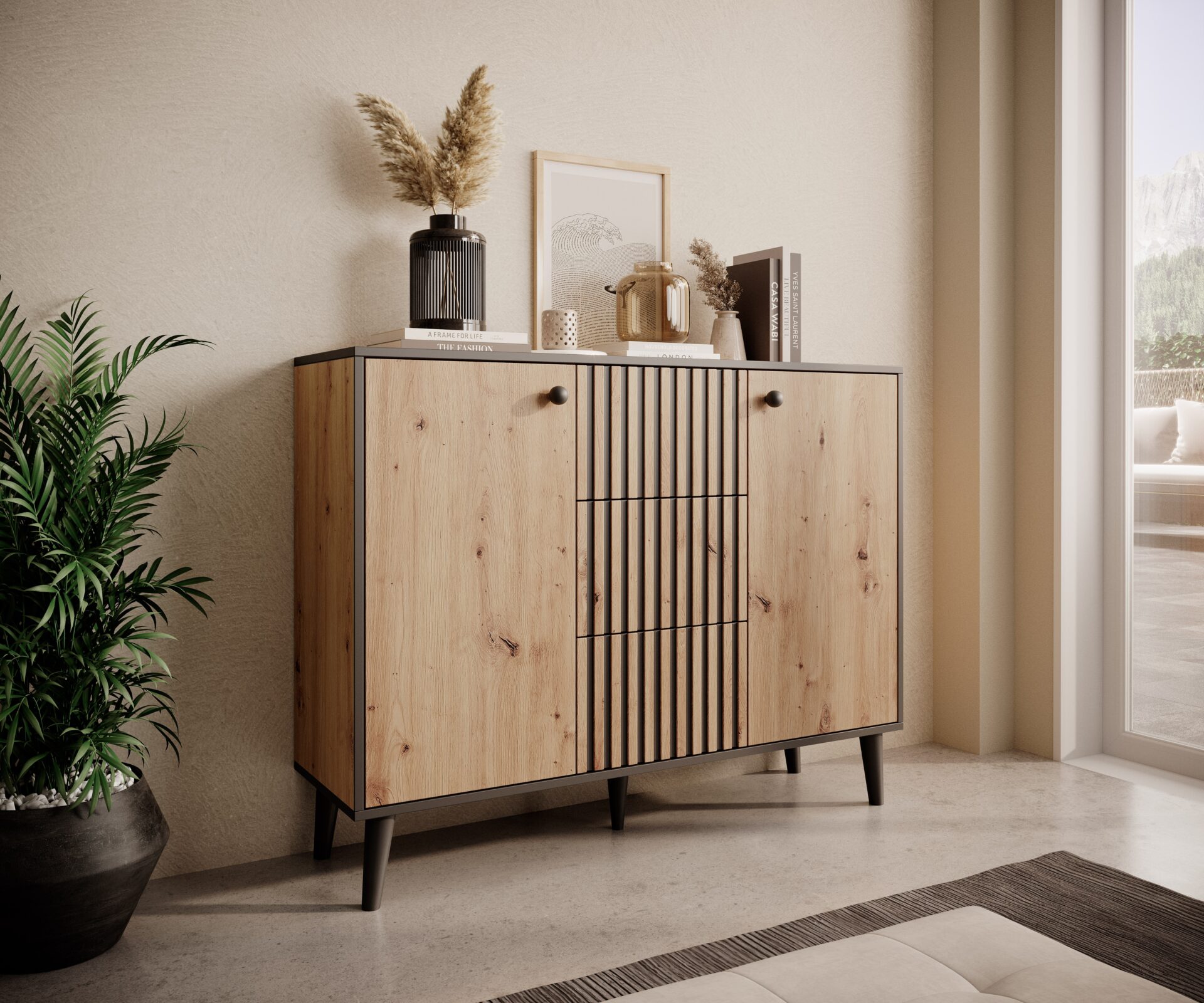 FADI komoda – tai tobulas minimalistinio dizaino ir lengvos formos derinys. Aukštos medinės kojelės suteikia jai žavesio, užtikrindamos stabilią ir tvirtą konstrukciją. Trys erdvūs stalčiai leidžia laikyti smulkius daiktus ar dokumentus, o dvi šoninės spintelės su lentyna viduje suteikia papildomos vietos daiktams susidėti. FADI komoda puikiai tiks jūsų svetainei, miegamajam ar prieškambariui.