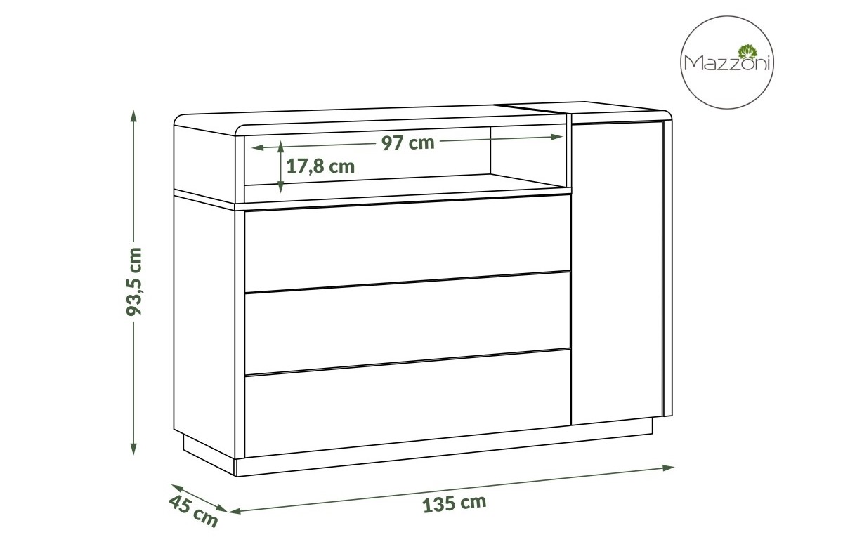 PLOTIS 135 cm, GYLIS 45 cm, AUKŠTIS 93,5 cm, MEDŽIAGOS MDF + Drožlių plokštė, PAVIRŠIUS Blizgus + Matinis, STILIUS Modernus, SVORIS SU PAKUOTE 90 kg