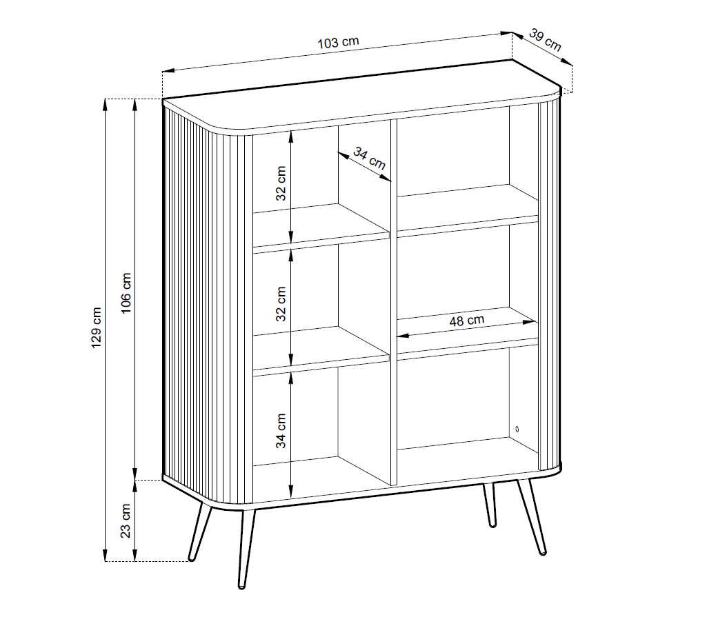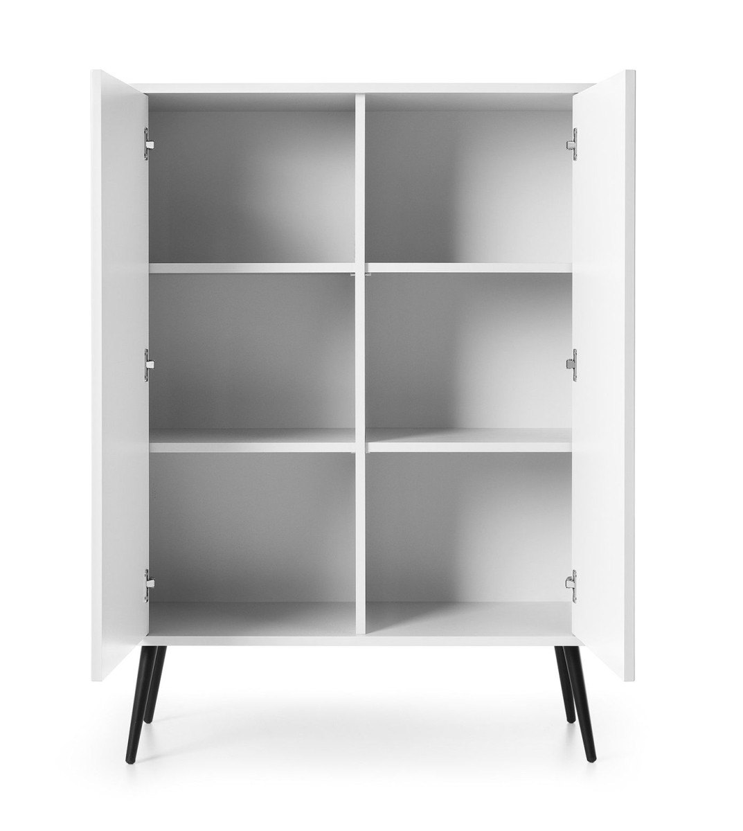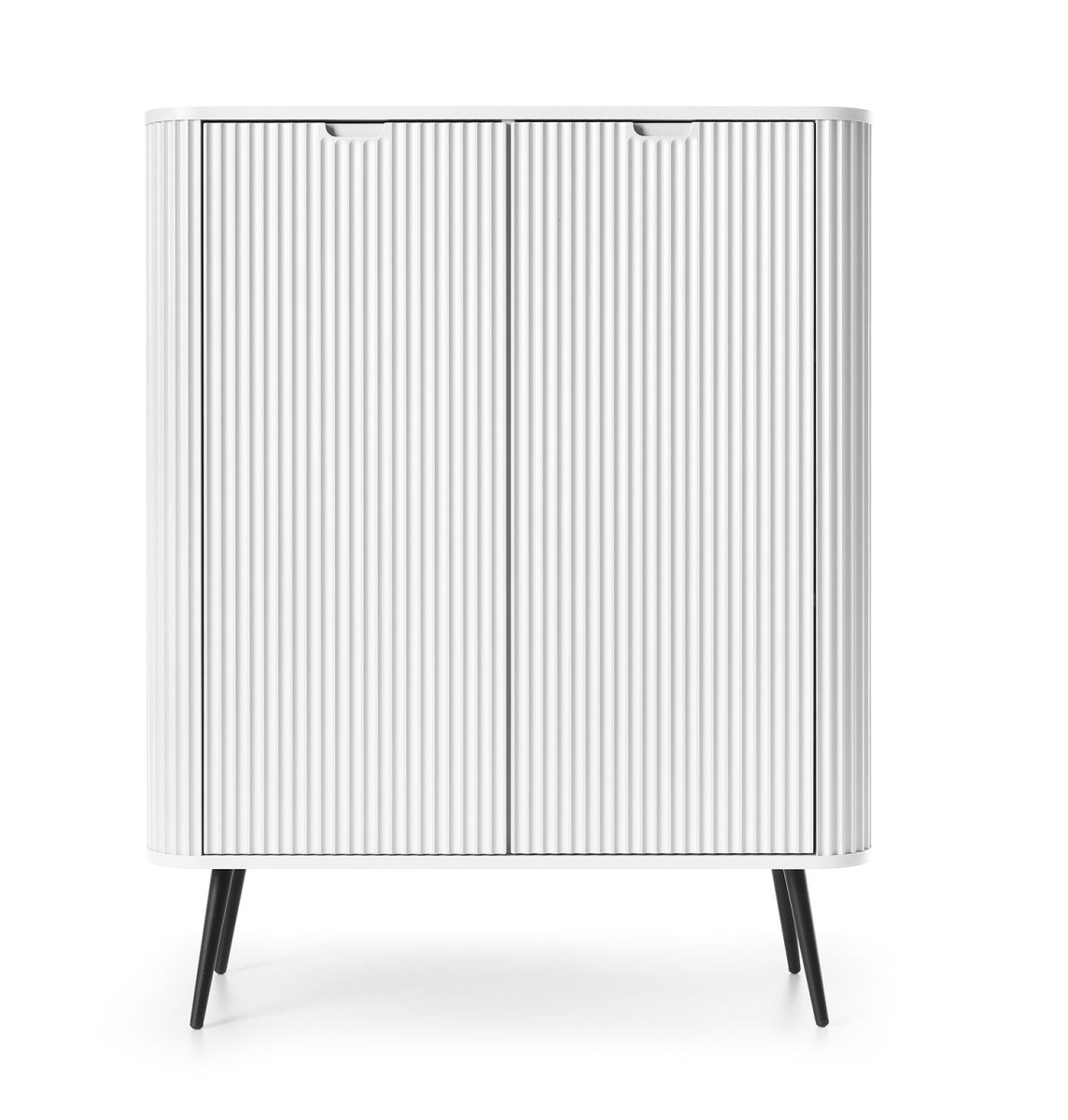 Balta komoda „Zova K-103“ – turi du priekius su lentynomis už jų.