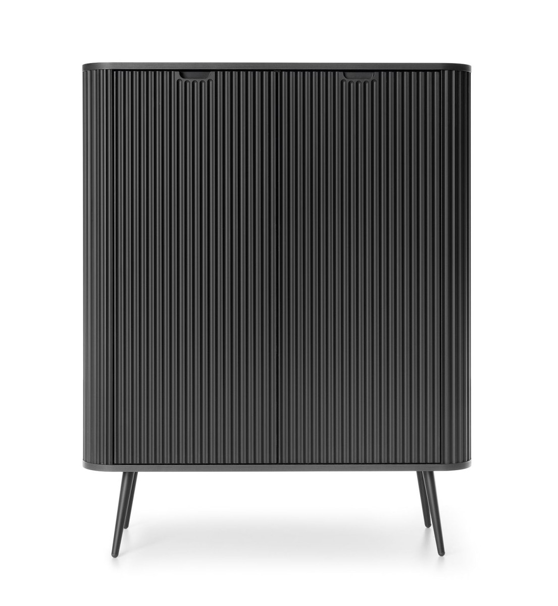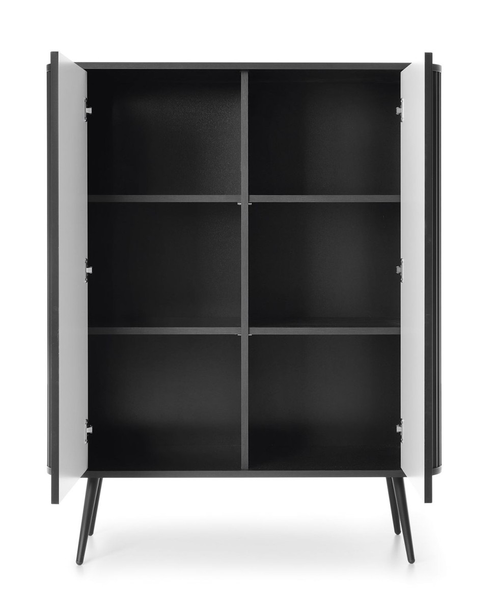 „Zova K-103“ juoda komoda – turi du priekius su lentynomis už jų.