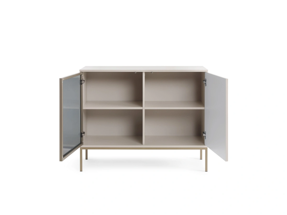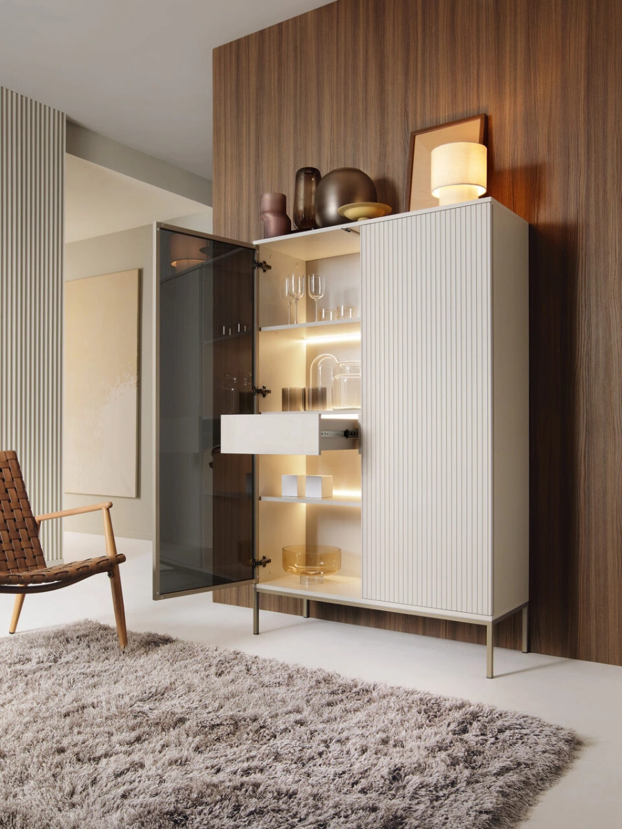 Sento K104 komoda – turi dvi spinteles – lentyną už fasadų, vieną stiklinę priekinę dalį, apšvietimą.
