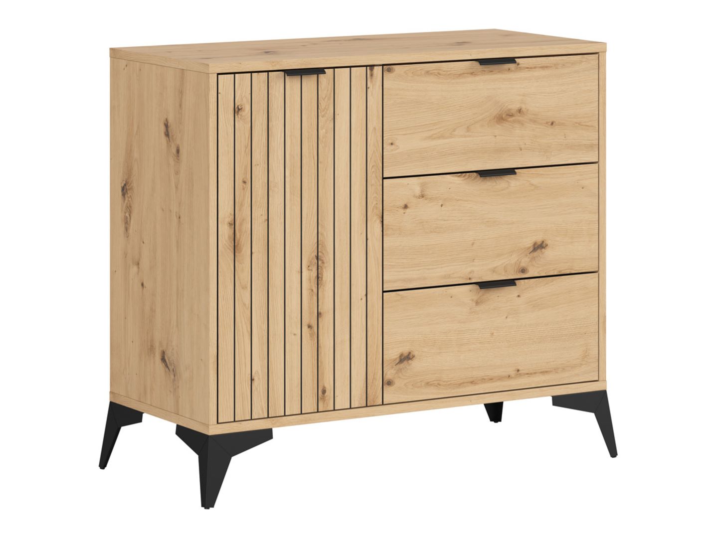 ’Lamea“ komoda – elegancija ir funkcionalumas viename. „Lamea“ kolekcija – tai harmoningas originalaus, gamtos įkvėpto dizaino ir visiško funkcionalumo derinys. Dėl laminato, kuris tiksliai atkuria medžio tekstūrą, ir juodų apdailos elementų naudojimo šios kolekcijos baldai spinduliuoja moderniu stiliumi ir suteikia šilumos bei jaukumo bet kokiam interjerui. 90 cm pločio „Lamea“ komoda – puikus sprendimas daiktų laikymui svetainėje ar miegamajame. Praktiškas jos vidus padalintas į tris stalčius ir dvi lentynas, kuriose patogu laikyti smulkius drabužius, staltieses ar rankšluosčius. Ant viršaus galima padėti vazą su gėlėmis ar kitais dekoratyviniais daiktais, todėl komodą galima naudoti ir kaip ekspozicijos vietą. Komodos fasadus puošia vertikalūs juodu laku padengti frezavimai, suteikiantys baldui erdvumo ir trimatumo. Šie kruopščiai sukurti grioveliai, imituojantys lenteles, yra viena iš naujausių interjero dizaino tendencijų, suteikiančių komodai modernų ir ryškų charakterį. Šiltas meniško ąžuolo atspalvis, būdingas šiai kolekcijai, puikiai dera su įvairiais interjero stiliais – nuo griežtų loftų iki jaukių bohemiškų interjerų. Dėl itin atsparaus įbrėžimams laminato baldai yra patvarūs, lengvai prižiūrimi ir estetiškai patrauklūs ilgus metus. Natūralaus medžio tekstūrą imituojantis raštas puikiai papildo juodus elementus, o aukštos kojelės suteikia komodai lengvumo. Atraskite kitus „Lamea“ kolekcijos baldus, kad sukurtumėte darnią ir funkcionalią kompoziciją savo interjere.