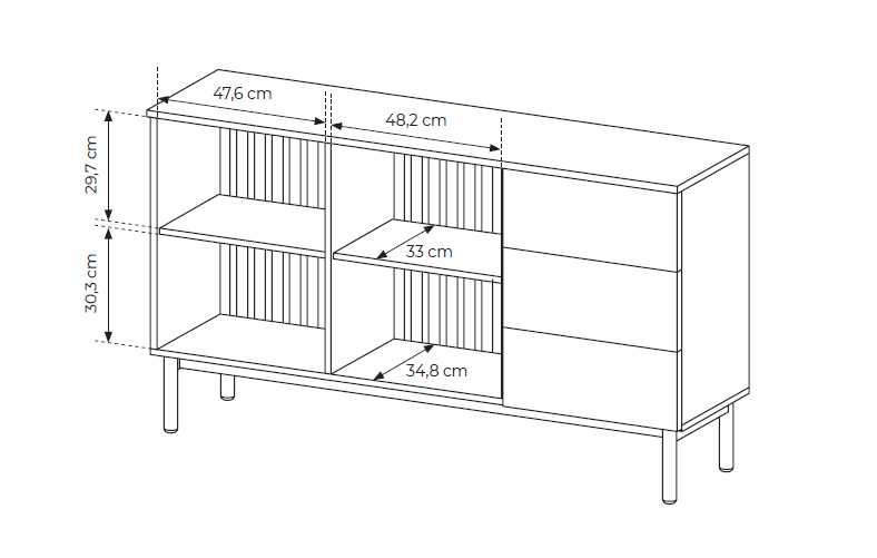 Lang komoda – turi dvi stiklines spinteles su apšvietimu, grotelių foną ir papildomus stalčius.