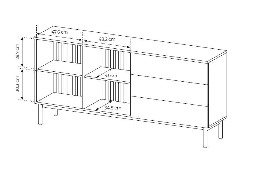 Lang komoda – turi dvi stiklines spinteles su apšvietimu, grotelių foną ir papildomus stalčius.