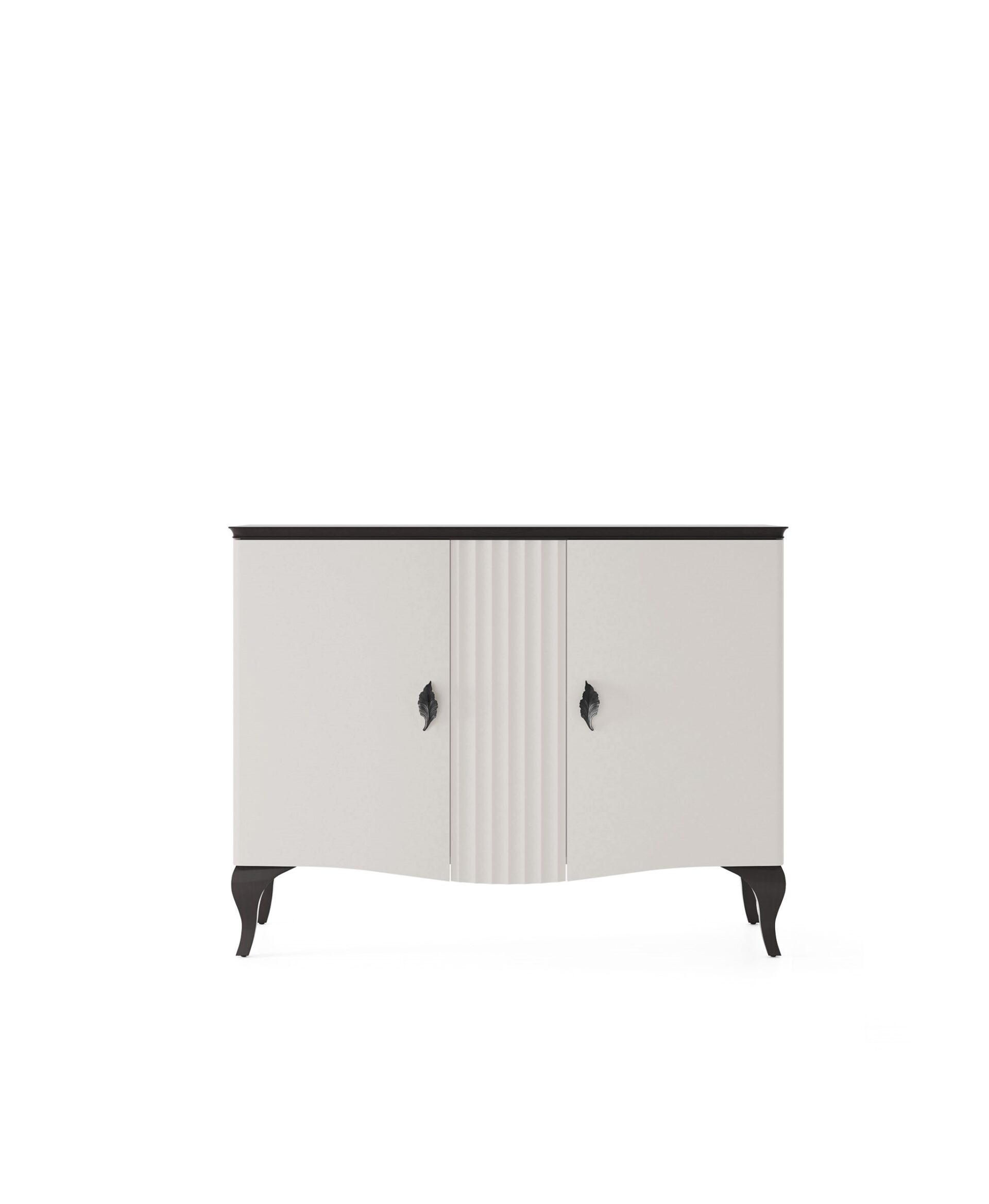 Komoda MADERA MD-K2. Unikali matinės savanos spalvos kolekcija su raižytais fasado intarpais ir kontrastingais juodais rėmais sukuria modernų charakterį. LED apšvietimo dėka vertikalūs vitrinų nugarėlių šešėliai subtiliai atkartoja gofruotus fasado intarpus. Paskutinis akcentas – lapo formos rankenėlės, kurios taip pat suteikia žavesio. Fasadas: frezuotas, dažytas MDF.