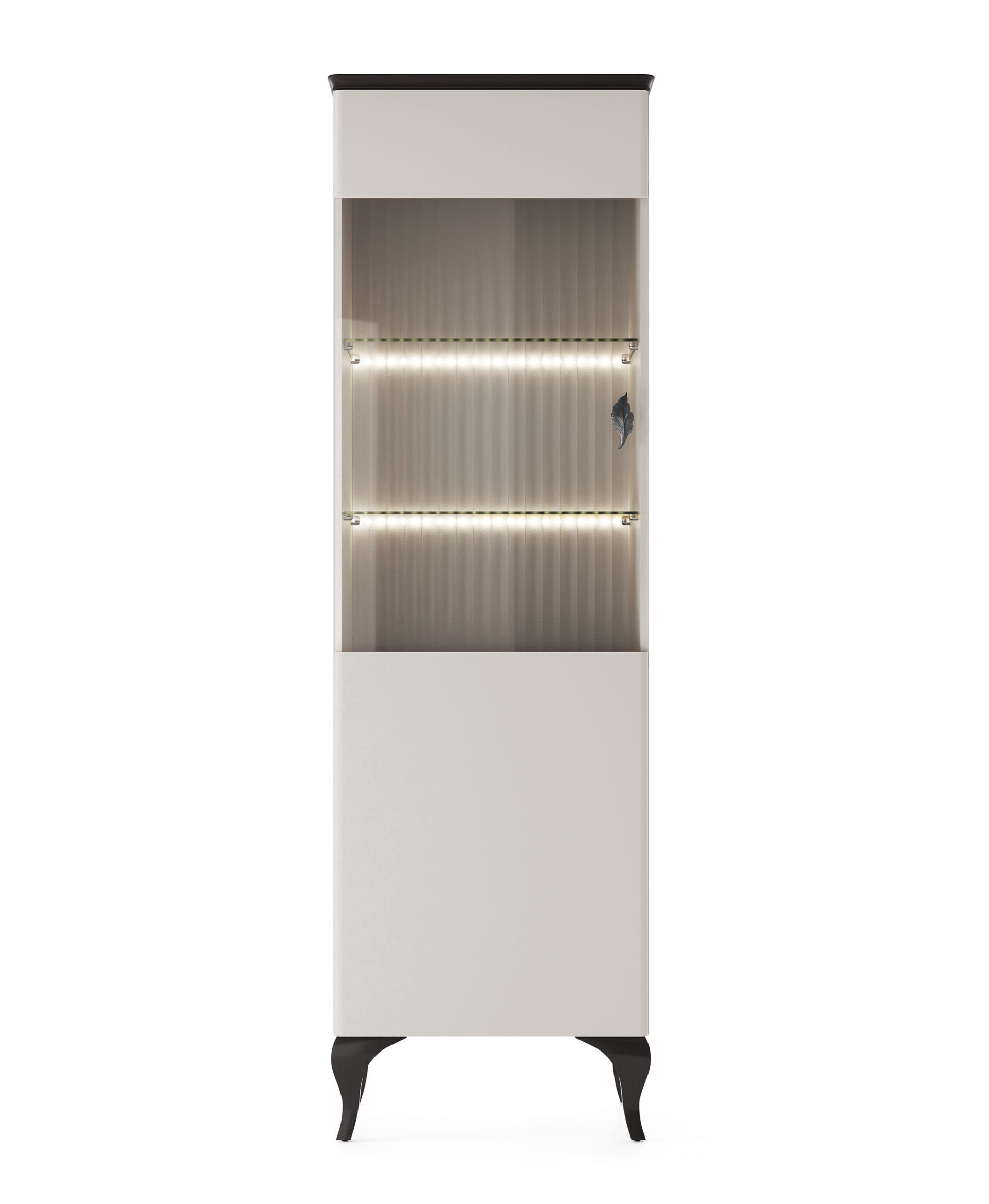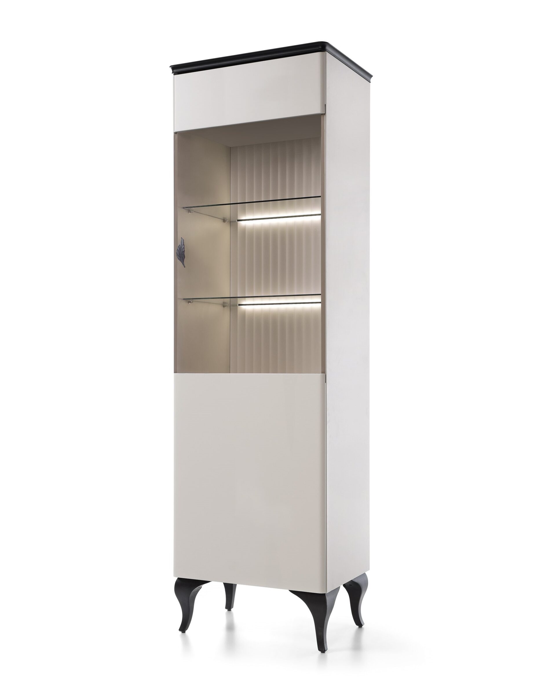 Indauja MADERA MD-W1/2. Unikali matinės savanos spalvos kolekcija su raižytais fasado intarpais ir kontrastingais juodais rėmais sukuria modernų charakterį. LED apšvietimo dėka vertikalūs vitrinų nugarėlių šešėliai subtiliai atkartoja gofruotus fasado intarpus. Paskutinis akcentas – lapo formos rankenėlės, kurios taip pat suteikia žavesio.