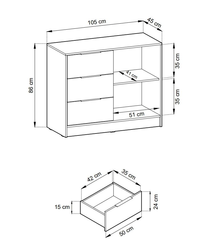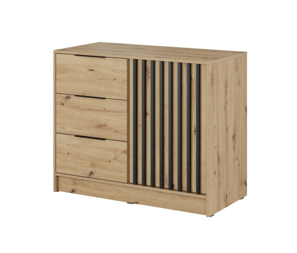 Komoda „Nelly“ pagaminta iš aukštos kokybės 16 mm storio laminuotos plokštės su ABS faneruotomis briaunomis.