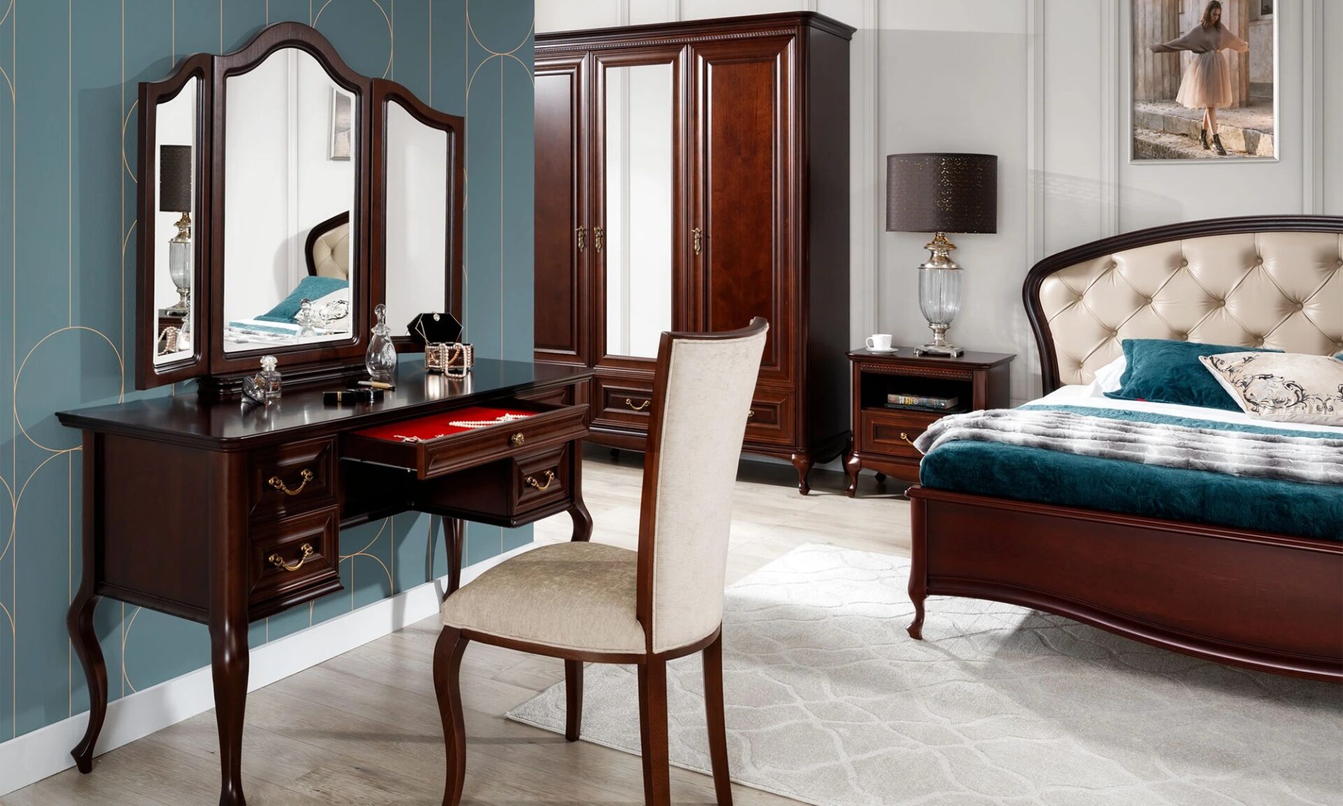 Gražią formą pabrėžia aukšta panaudotų medžiagų (alksnio medienos ir alksnio faneros elementų) kokybė. Baldai siūlomi keturių spalvų: ruda, balta, balta patina, kreminė, kreminė patina.