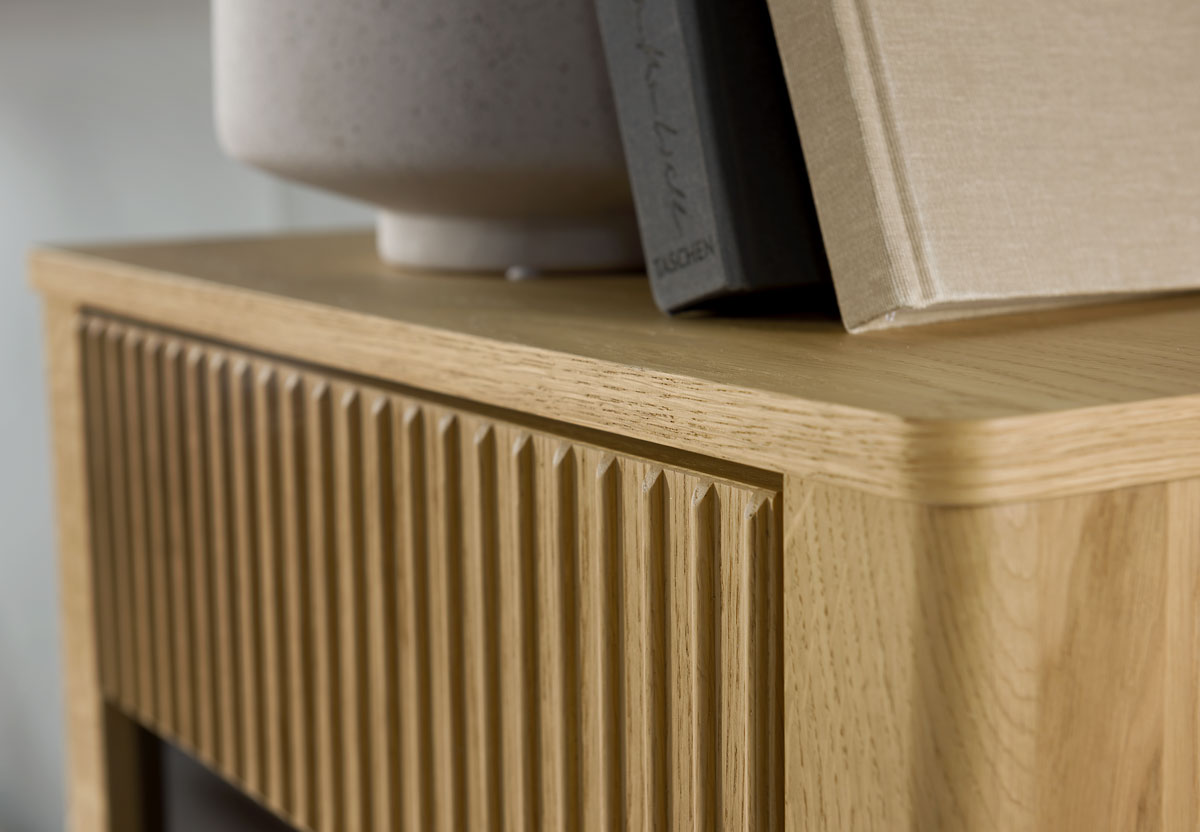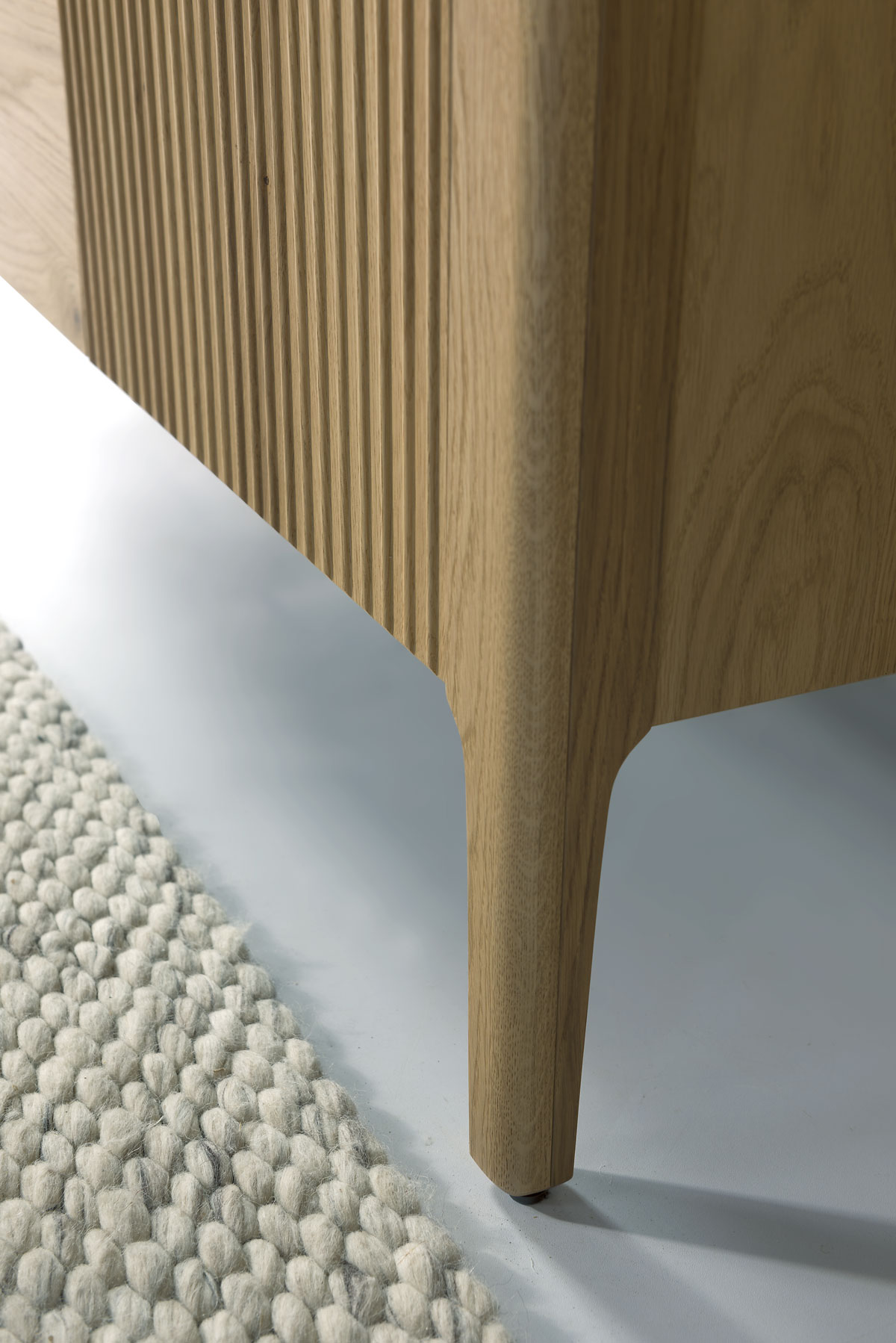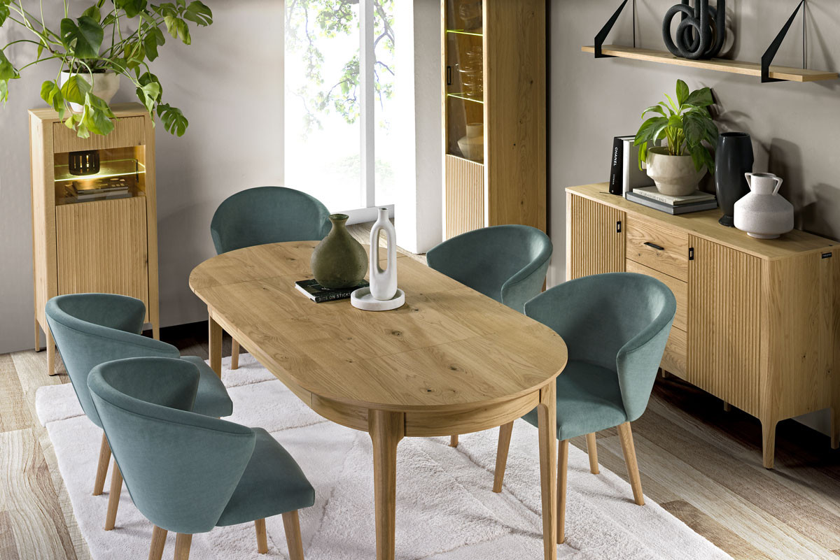 Naudojami vyriai ir kreipiančiosios su tylaus uždarymo sistema. Baldai su madingu, natūralaus ąžuolo, raižyto reljefo fasadu suteiks jaukumo tiek svetainei, tiek valgomajam.