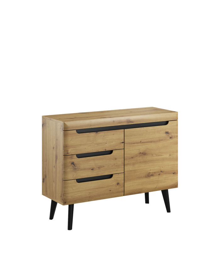 „Nordi NKSZ107 Artisan Oak/Black“ komoda su durelėmis ir stalčiais, pasižyminti moderniu charakteriu ir santūriu skandinaviško dizaino elementais, puikiai tiks šiuolaikinėse svetainėse ir poilsio kambariuose. Komplektą sudaro dvejos varstomos durys, už kurių yra horizontalios lentynos, ir trys praktiški stalčiai smulkiems daiktams, papuošalams ir niekučiams susidėti. Apatinėje dalyje yra aukštos medinės kojelės (20 cm), suteikiančios lengvumo ir originalumo. Šios kojelės leidžia naudoti valymo robotus, kad patalpa būtų švari. Indauja pagaminta iš laminuotos baldų plokštės, kuri pasižymi padidintu atsparumu įbrėžimams, o priekyje – patvari MDF plokštė. Spintelė priklauso to paties pavadinimo kolekcijai, kurią sudaro komodos, spinta, stalas, lentyna, televizoriaus staliukai ir kavos staliukas. Komoda pristatoma supakuota su lengvai suprantamomis surinkimo instrukcijomis. Taip pat galima įsigyti baltos / Riviera ąžuolo spalvos.